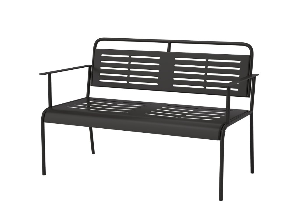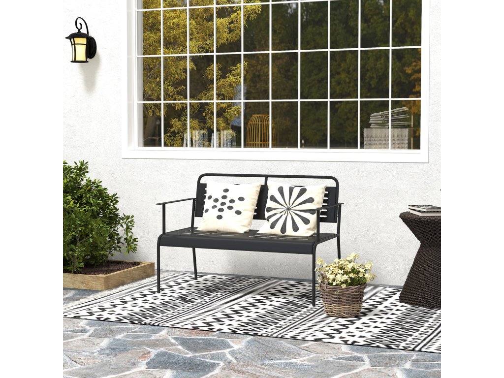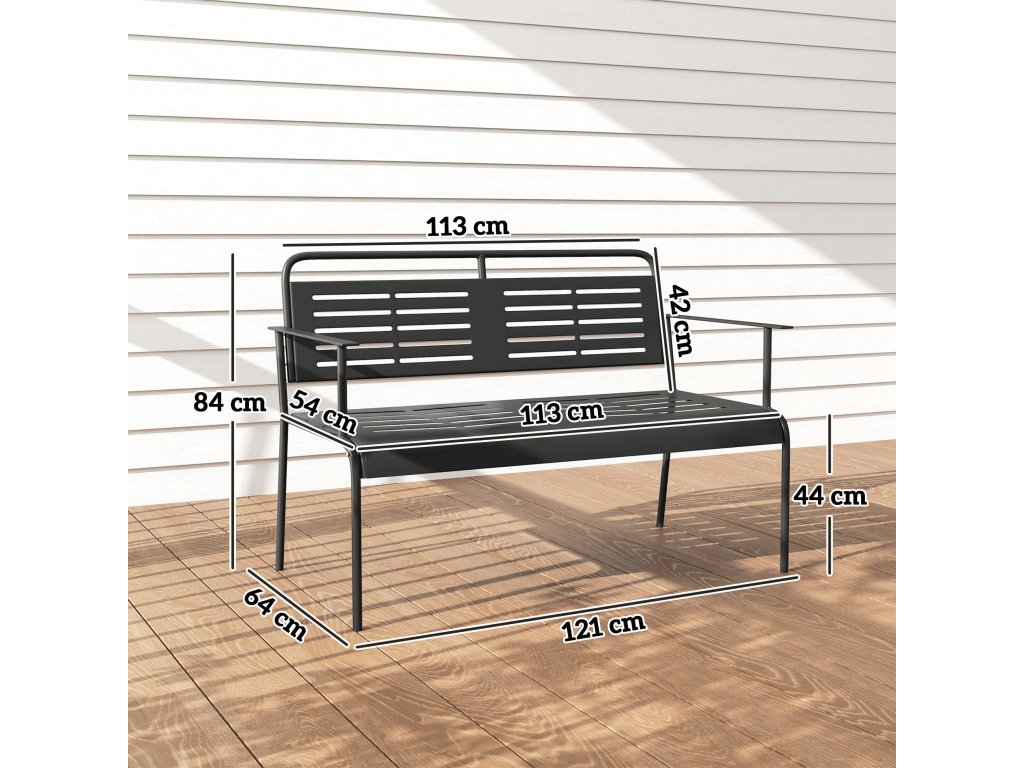 Užijte si odpočinkové hodiny na elegantní venkovní lavici [BRAND NAME]. Robustní ocelový rám zahradní lavičky je odolný proti korozi a práškově lakovaný. Lavice unese až 240 kg a pohodlně se na ni vejdou dva dospělí. Opěradlo je mírně sklopené o více než 90°, což zajišťuje ideální pohodlí, a jednoduchý design se dokonale hodí do jakéhokoli venkovního prostředí.