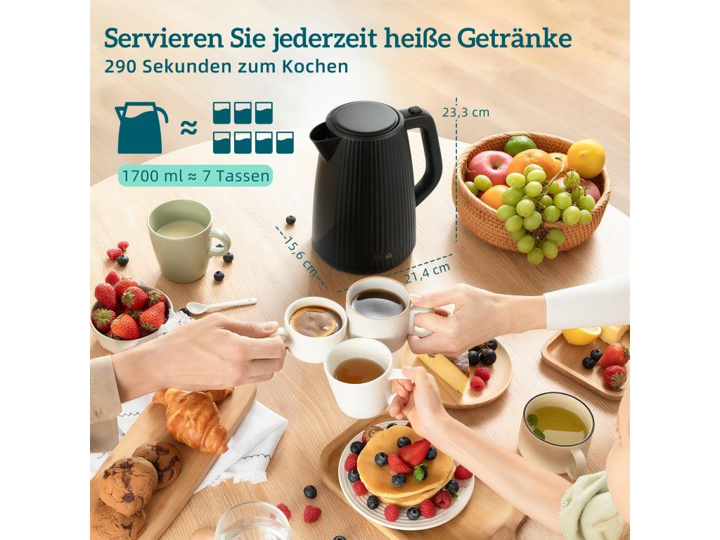 ✔ Rychlovarná konvice o objemu 1,7 l urychluje přípravu čaje a kávy.