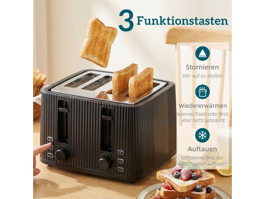 Rodinný toustovač na 4 plátky: Opékejte čtyři plátky najednou. Se 7 úrovněmi opečení, rozmrazováním, ohřevem, zrušením, vysouvacím designem a miskou na drobky pro snadné čištění. Ideální pro individuální opékání.