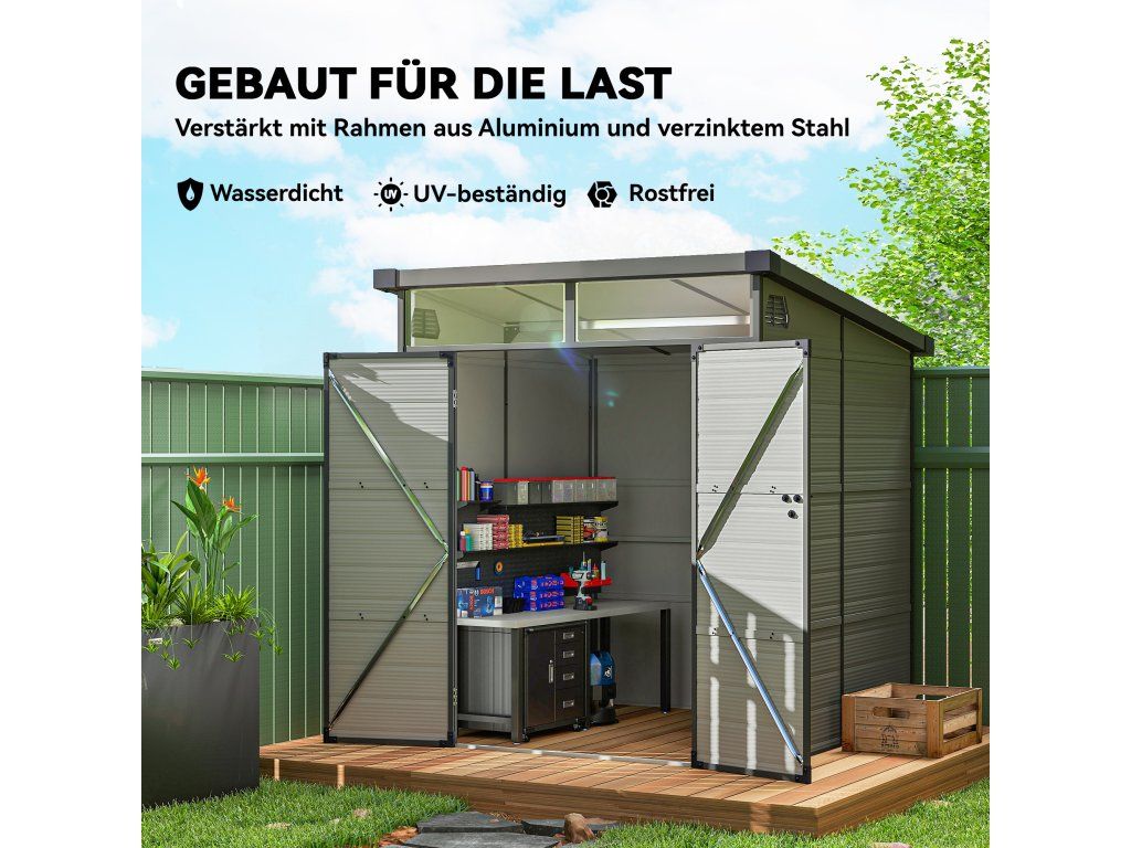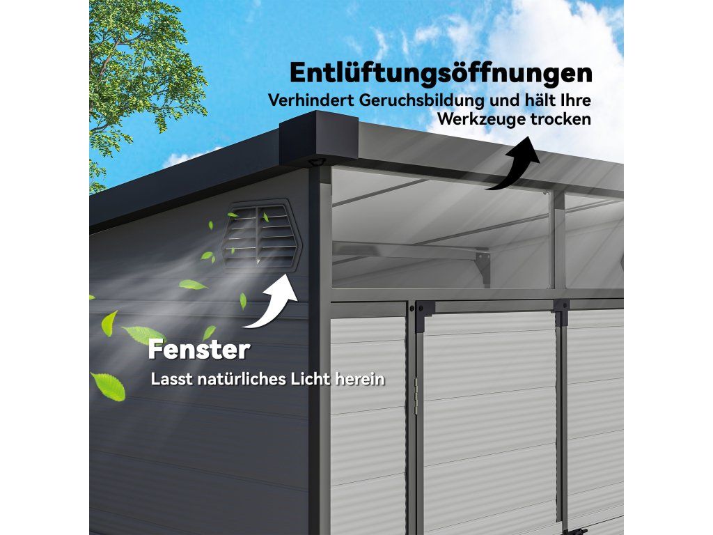 Zažijte snadnou organizaci s přístřeškem na kola, vyrobeným z lehké, vodotěsné plastové pryskyřice a s robustním hliníkovým rámem. Dvě průhledná okna poskytují přirozené světlo, zatímco dvojité větrací otvory zajišťují čistý vzduch. Pultová střecha účinně zabraňuje hromadění vody a sněhu – perfektní doplněk do každé zahrady.