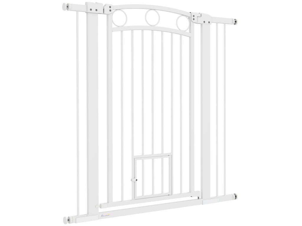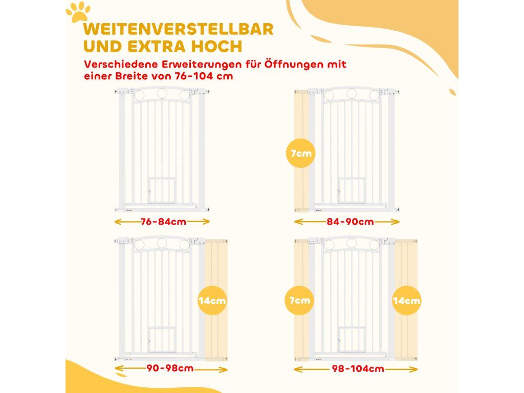 Objevte naší psí branku: flexibilní řešení pro bezpečnost vašich mazlíčků. Tato vysoká a široká branka se dá nastavit od 76 do 104 cm, takže je ideální pro různé prostory. Díky dvojitému zamykání a praktickým dvířkám pro kočky je tato branka ideální pro domácnosti s více domácími mazlíčky. Stylová a praktická – nezbytný doplněk pro každého majitele domácího mazlíčka.