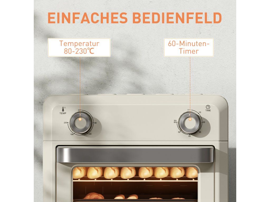 Precizní pohodlí: Ovládejte teplotu od 80 do 230 °C a nastavte časovač až na 60 minut pomocí dvou otočných knoflíků, zatímco vnitřní osvětlení umocňuje požitek z dokonalých výsledků pečení.