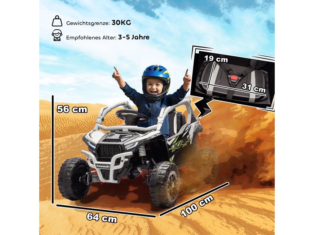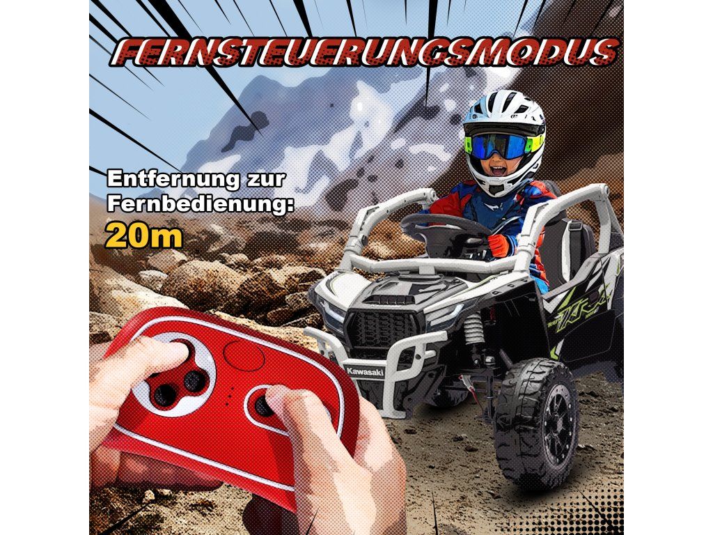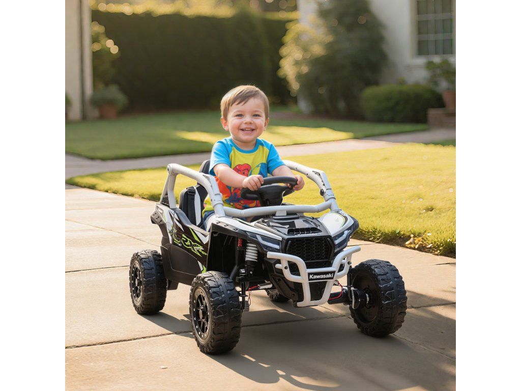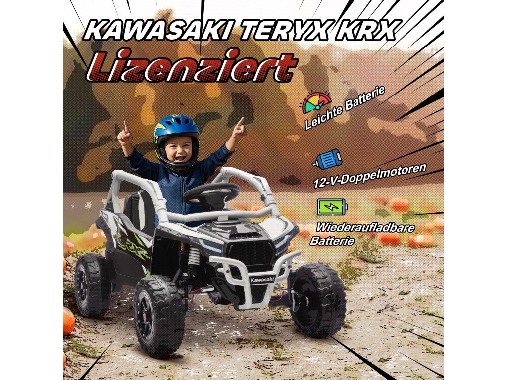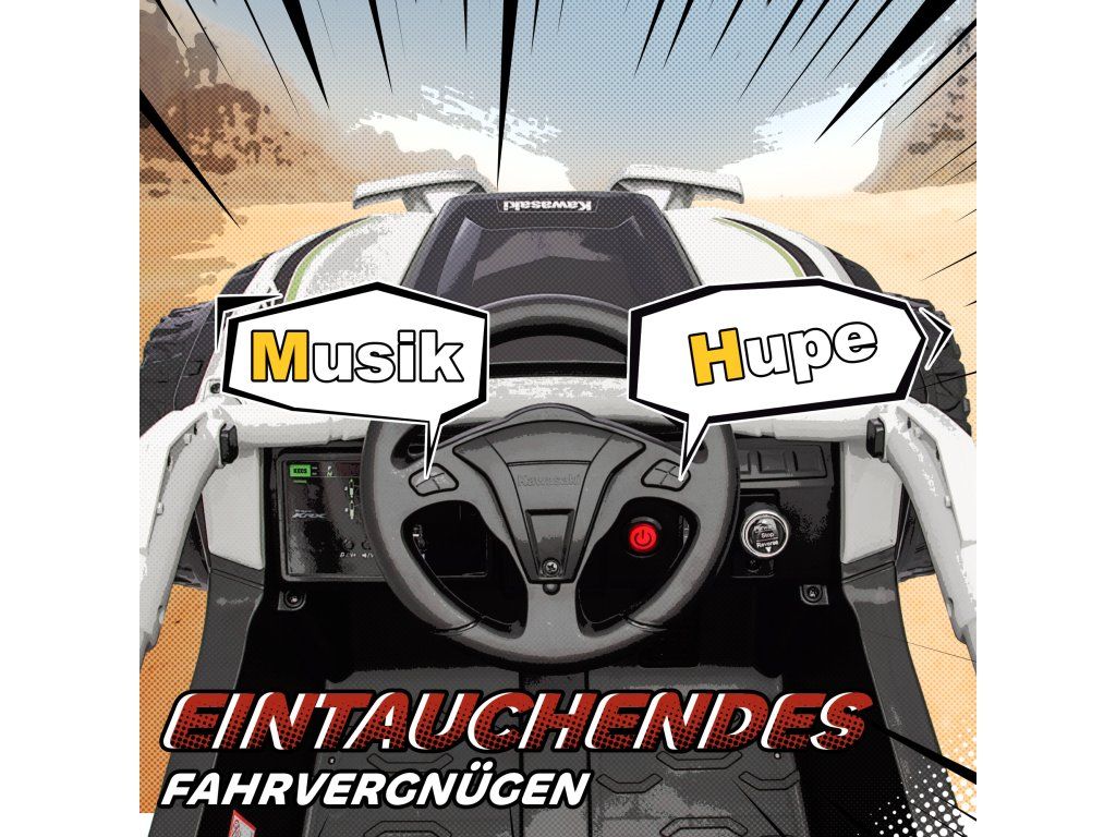 Hledáte hračku, která dokonale spojuje dobrodružství a bezpečnost? Dětská elektrická UTV KAWASAKI TERYX KRX 1000 to nabízí: Díky duálním motorům a skutečnému kokpitu zaručuje hodiny zábavy. Díky rodičovskému dálkovému ovládání máte vše vždy pod kontrolou a můžete si společně užívat bezstarostné chvíle. Robustní konstrukce, tlumící odpružení a hudební funkce zajišťují nekonečnou zábavu a objevování pro vašeho malého dobrodruha.