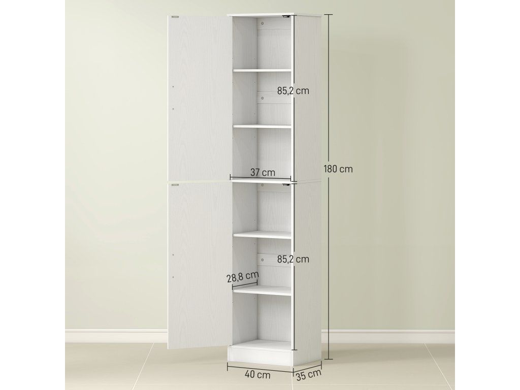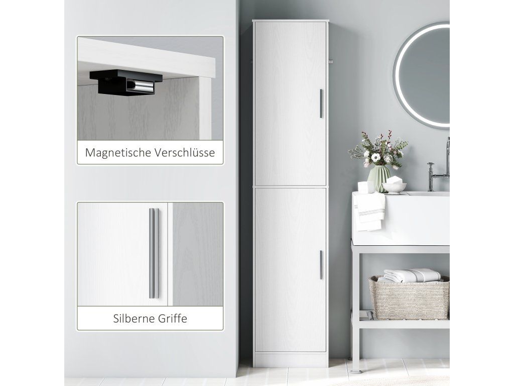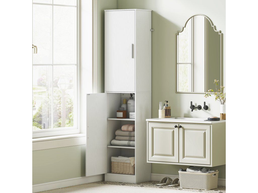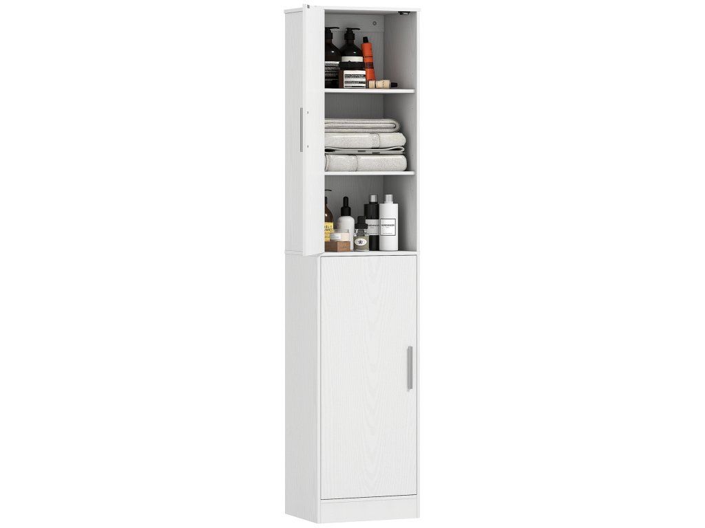 Tato volně stojící vysoká skříňka se dvěma dveřmi vnese do vaší koupelny pořádek tím, že úhledně uloží šampon, toaletní potřeby, ručníky a další nezbytnosti na šesti nastavitelných policích, které pojmou i velké lahve. Štíhlý a vysoký design skříňky, navržený speciálně pro malé prostory, optimálně využívá vertikální prostor a její minimalistický styl se bez problémů hodí do jakéhokoli interiéru. Vítejte v uklizené a organizované koupelně!
