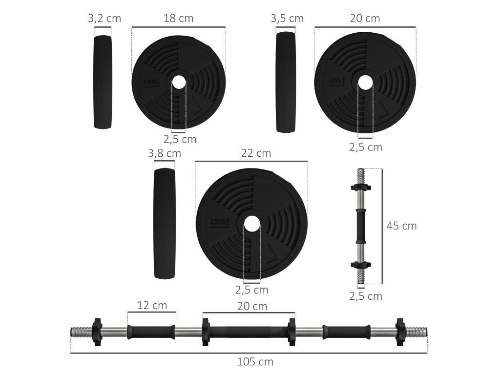 ✔ Hmotnost disku: (2,5 kg) Ø22 x 3,8 cm, (2 kg) Ø20 x 3,5 cm, (1,5 kg) Ø18 x 3,2 cm