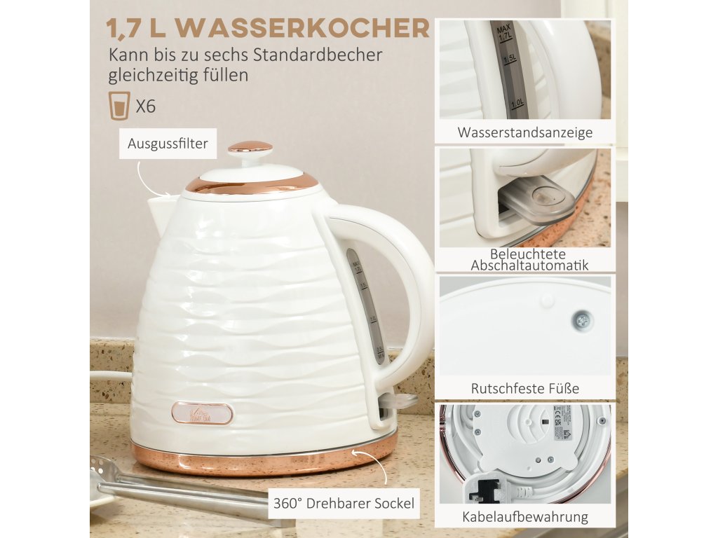 ✔ Konvice o objemu 1,7 litru, která je součástí snídaňové sady, je vybavena snadno čitelným ukazatelem hladiny vody a termostatem Otter.
