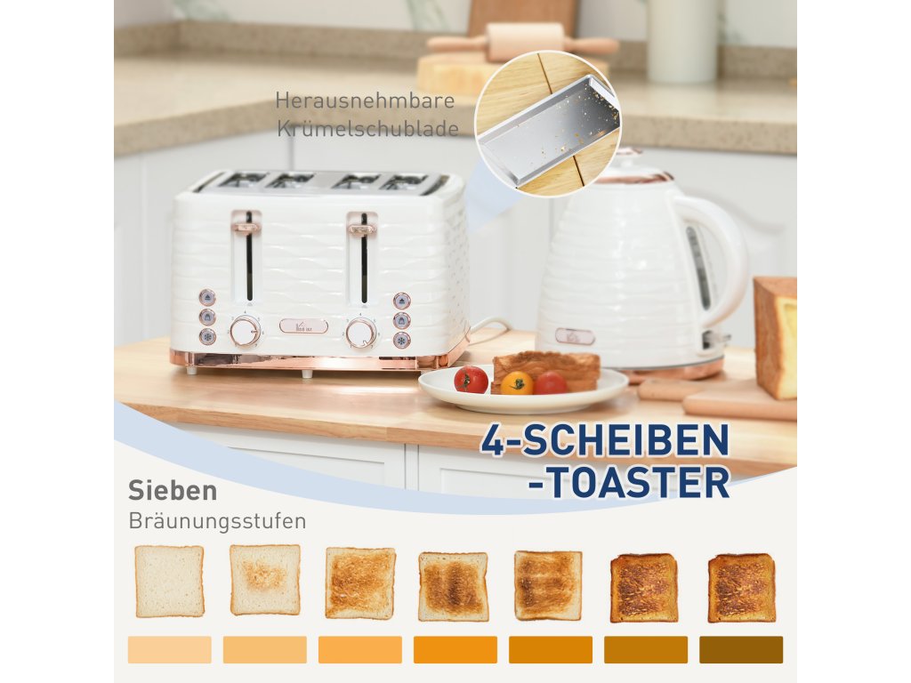 Bezpečný a snadno se čistí: Toustovač je vybaven miskou na drobky pro snadné čištění. Bezdrátová konvice je vybavena ochranou proti přehřátí a funkcí vypnutí při vaření nasucho pro zajištění maximální bezpečnosti.