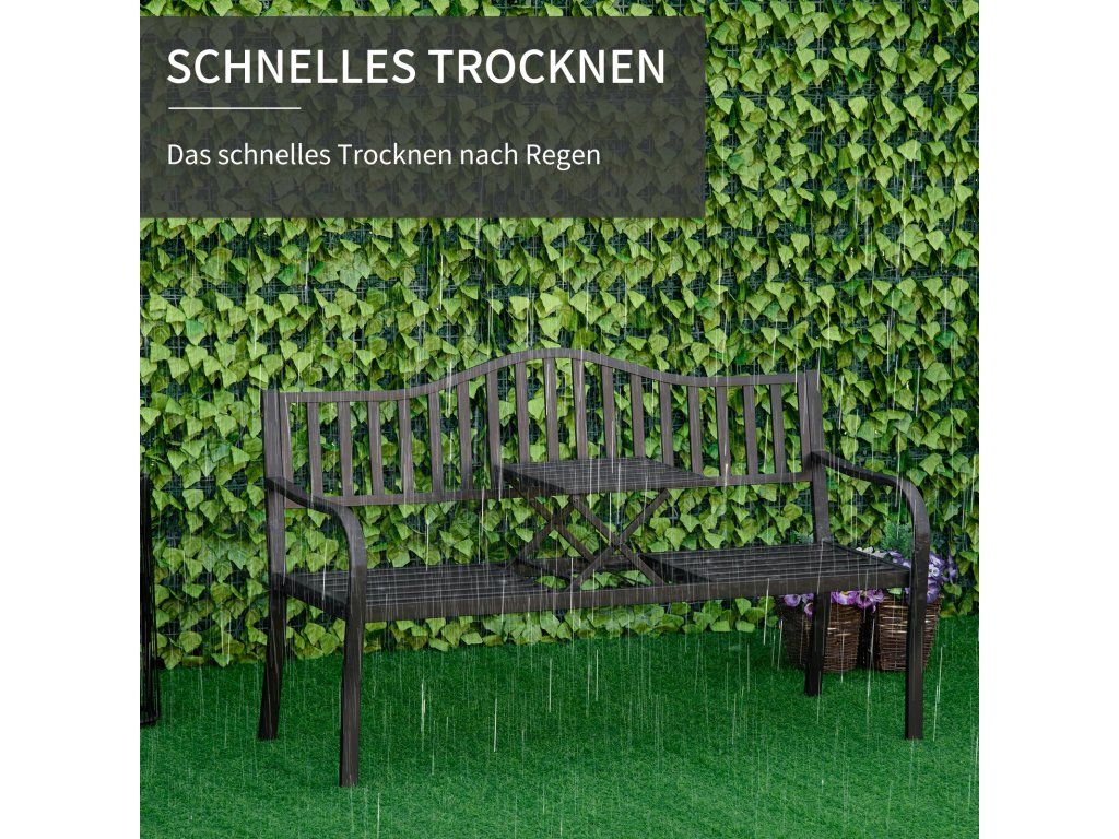 ODOLNÁ KONSTRUKCE: Práškově lakovaný kovový rám lavice poskytuje stabilní oporu a odolává mírnému počasí. Laťková konstrukce zabraňuje hromadění vody a umožňuje rychlé schnutí po dešti.