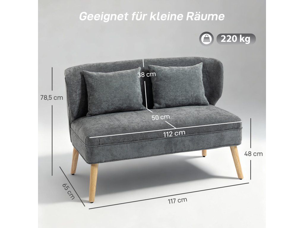 Kompaktní pro malé prostory: S šířkou pouhých 117 cm je tato kompaktní dvoumístná pohovka ideálním řešením pro malé byty, ložnice, studia nebo útulné koutky, které efektivně maximalizují dostupný prostor.