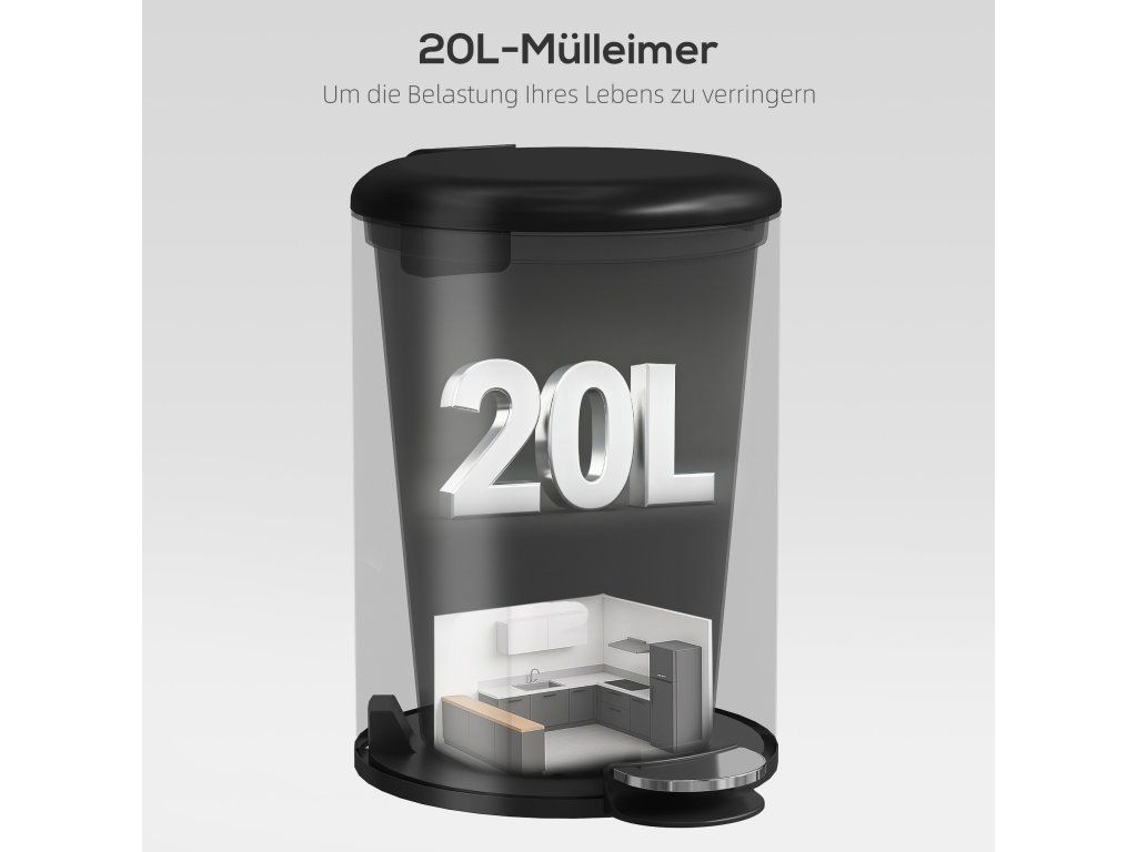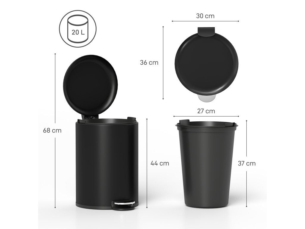 Objevte odpadkový koš: kompaktní, s objemem 20 litrů, ideální do každé místnosti. Tichý provoz díky víku s jemným zavíráním, ovládání bez použití rukou pomocí pedálu. Vyjímatelný vnitřní kbelík a otevíratelné víko usnadňují čištění a výměnu vložek do koše. Povrch odolný proti otiskům prstů udržuje koš s pedálem čistý a elegantní. Ideální do kuchyně, kanceláře nebo koupelny.