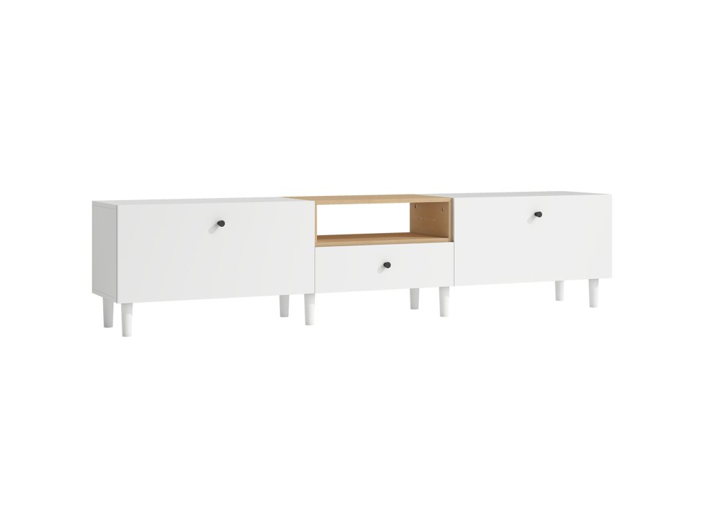 Užijte si relaxační večery, kdy je vše na svém místě. TV stolek se dvěma výsuvnými přihrádkami, zásuvkou a otevřenou policí udrží vaše konzole a příslušenství uspořádané. Na plochu o šířce 200 cm se vejdou televizory s úhlopříčkou až 90 palců. Tiché panty s tlumeným dovíráním zajišťují plynulý chod, zatímco bílý rám, přírodní dřevo a černé detaily vnesou do vašeho obývacího pokoje moderní a teplé kouzlo.
