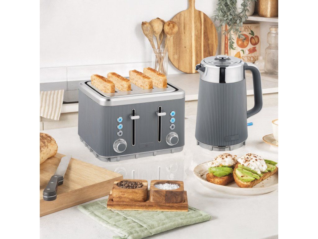 Moderní snídaňová sada: Šedý povrch, žebrovaná textura, chromové akcenty. Harmonický design, ideální pro ucelený vzhled. Perfektní dárek pro nastěhování, svatbu nebo pro nové majitele domů.