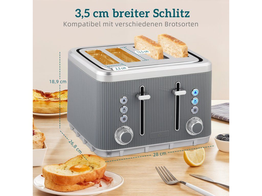 Toustovač na čtyři plátky: S funkcemi rozmrazování, ohřívání a zrušení a 7 úrovněmi opečení. Automatické vystředění zajišťuje rovnoměrné opečení. Chléb se po opečení automaticky vysune pro snadný přístup.