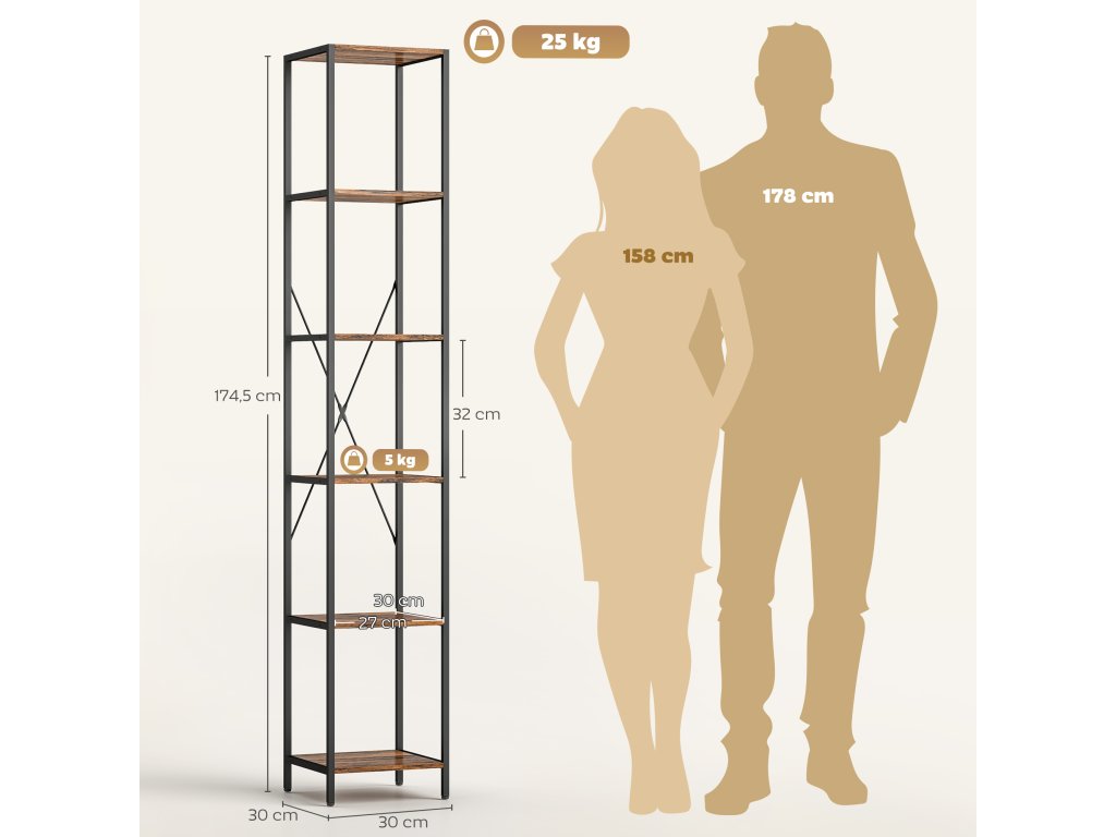 Prostorná šestipatrová police: Naše knihovna, široká pouze 30 cm, nabízí šest velkorysých polic, které poskytují dostatek úložného prostoru, aniž by zabíraly mnoho místa. Udržujte své oblíbené knihy uspořádané a snadno viditelné a dodejte svému obytnému prostoru nádech elegance díky elegantnímu a prostorově úspornému designu.