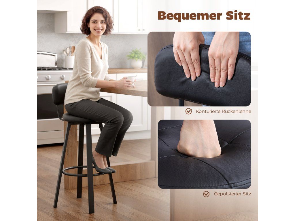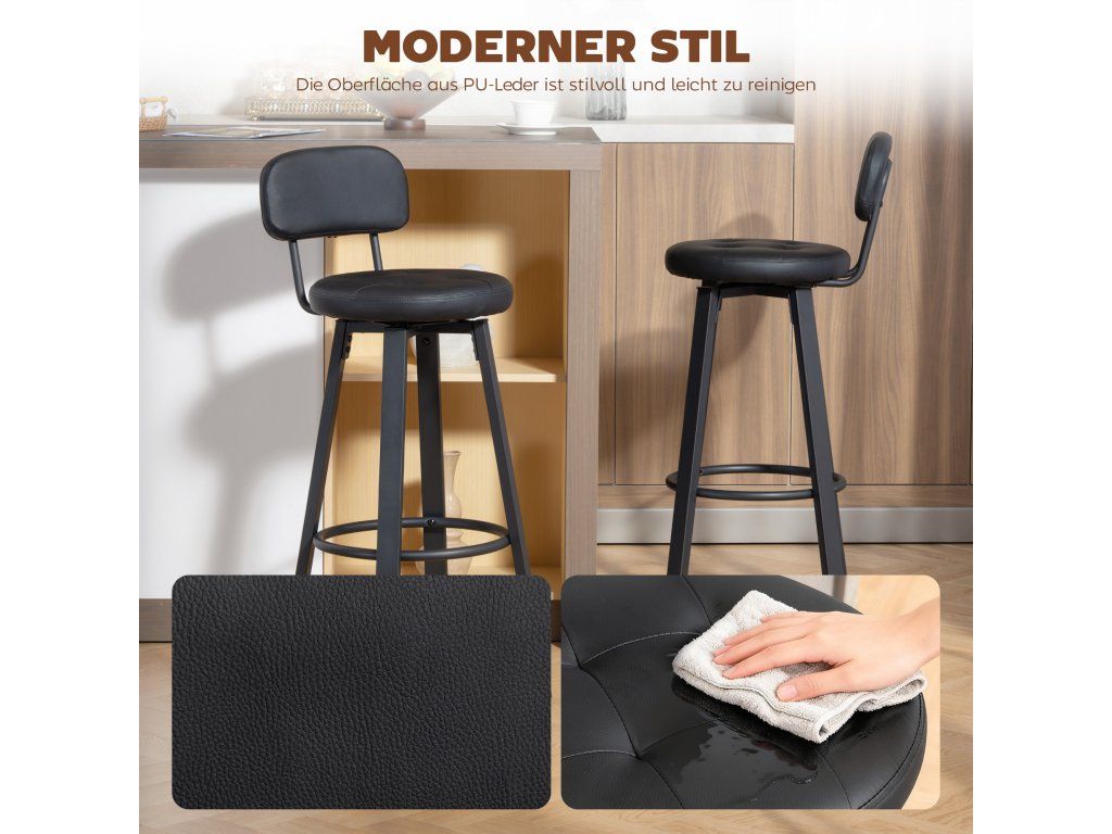 Pohodlné sezení: Tyto barové stoličky mají polstrovaný sedák a ergonomicky tvarované opěradlo, které zaručují trvalé pohodlí. Odolné čalounění z umělé kůže se snadno čistí, což z nich činí ideální volbu pro váš domov.