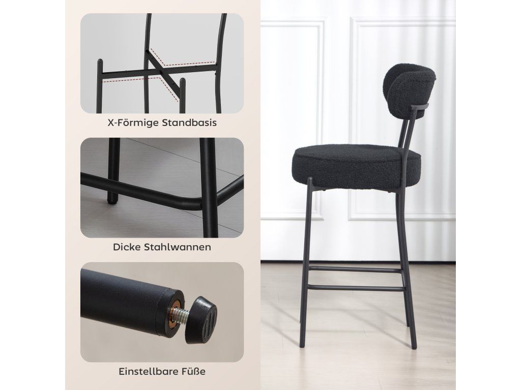 Stabilní konstrukce: Každá barová stolička je navržena se stabilními ocelovými nohami a zesílenými podnožkami a unese až 120 kg. Nastavitelné opěrky nohou zajišťují stabilitu i na nerovné podlaze.
