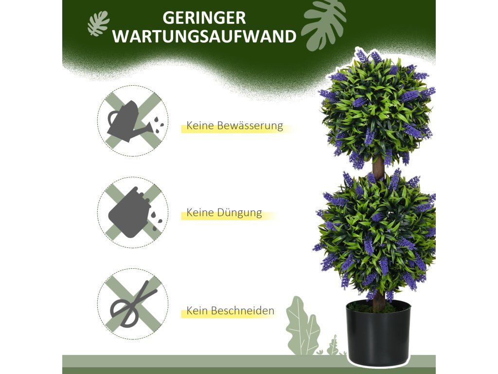 Zažijte trvalou zeleň s našimi umělými levandulovými stromy, které se prodávají v sadě dvou kusů a jsou ideální pro použití v interiéru i exteriéru. Robustní, realisticky detailní plastové listy a květy vytvářejí nápadně živý vzhled. Naše stabilní umělé rostliny díky svým cementovým květináčům okamžitě upoutají pozornost a neuvěřitelně snadno se o ně pečuje. Jednoduše je vybalte, postavte a užijte si dotek realistické přírody.