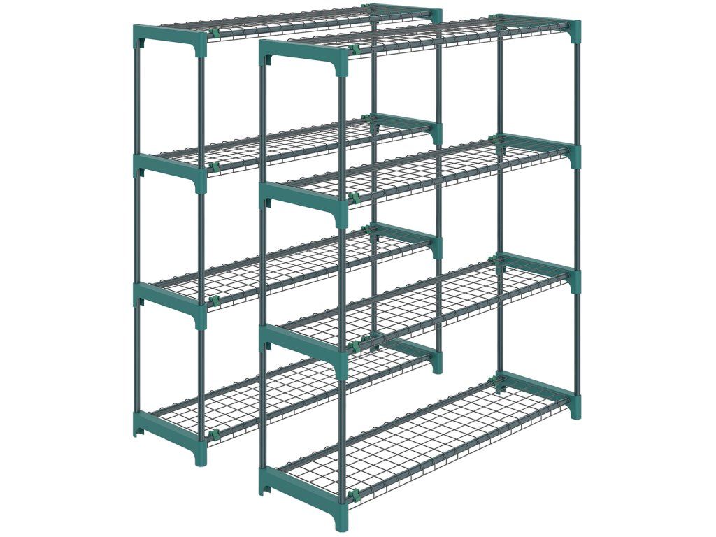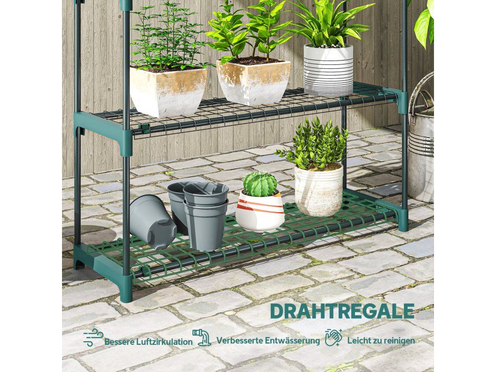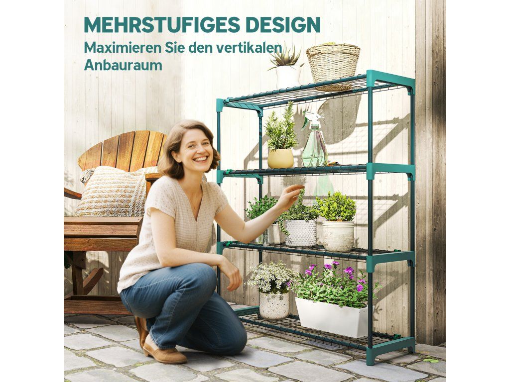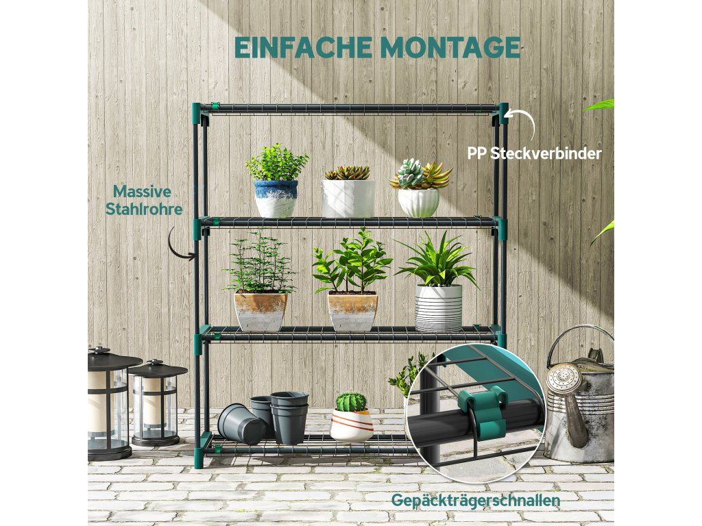 Snadná montáž: Zásuvná konstrukce umožňuje rychlou montáž. Policové spojky na stojanu zajišťují stabilitu. Sestavení trvá jen pár minut, takže můžete ihned začít organizovat své rostliny.