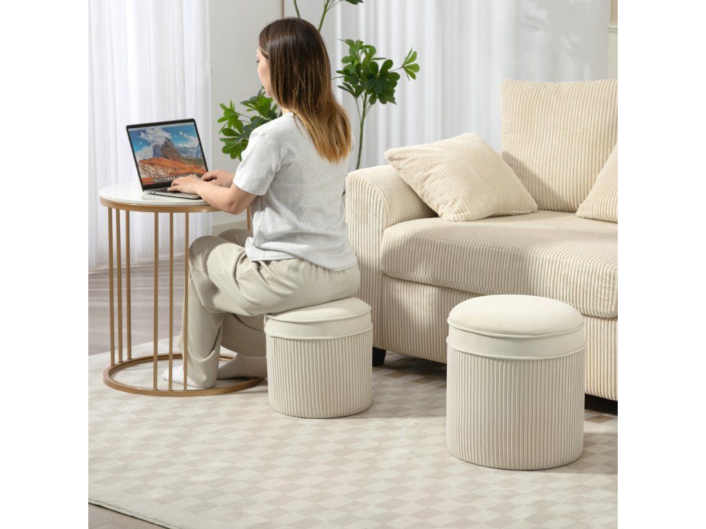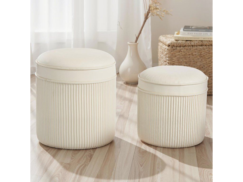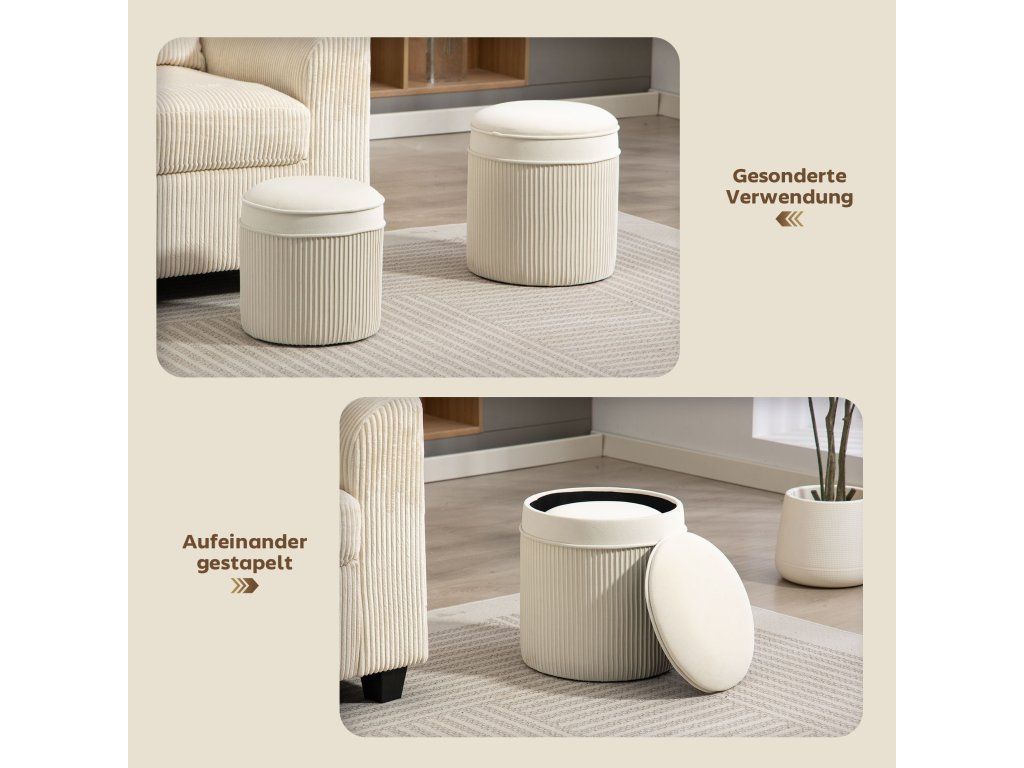 Prostorově úsporný design: Jednoduše vložte menší úložný taburet do většího a vytvořte tak více prostoru – chytrý design pro otevřenější uspořádání místnosti.