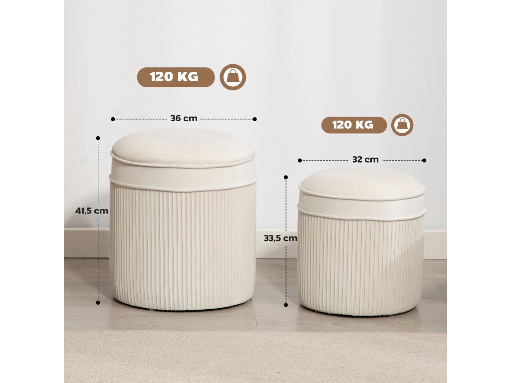 ✔ Dodává se se dvěma úložnými taburety, z nichž menší lze uložit do většího pro úsporu místa.