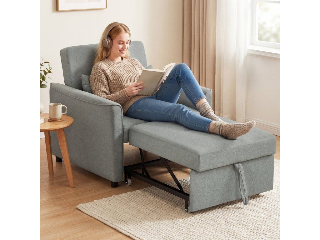 Proměňte svůj prostor s křeslem 3 v 1! Snadno se během několika sekund přeměníte z pohodlného křesla na lenošku nebo postel – ideální pro malé prostory nebo nečekané hosty. Přizpůsobte si pohodlí pomocí třípolohového nastavitelného opěradla, které je ideální pro čtení, relaxaci nebo zdřímnutí. Čalouněné prodyšnou lněnou látkou a polstrované silnou pěnou kombinuje stylový design s pohodlnou oporou.