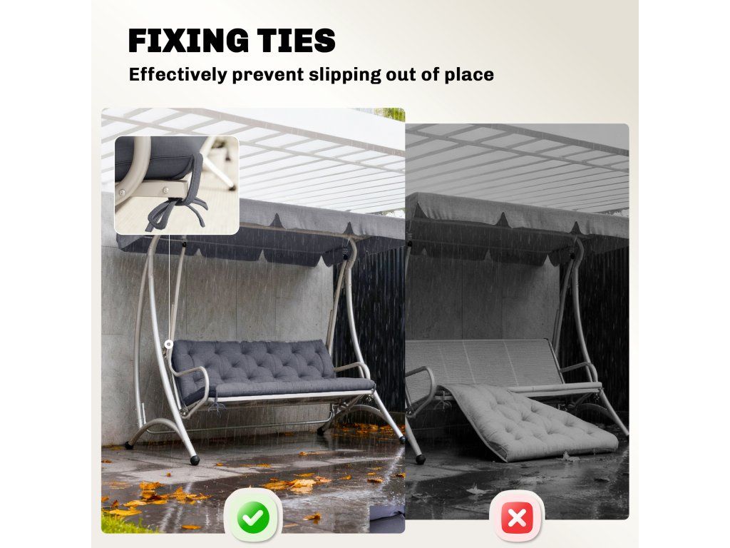 ✔ Popruhy na sedáku pro bezpečné uchycení k venkovnímu nábytku.