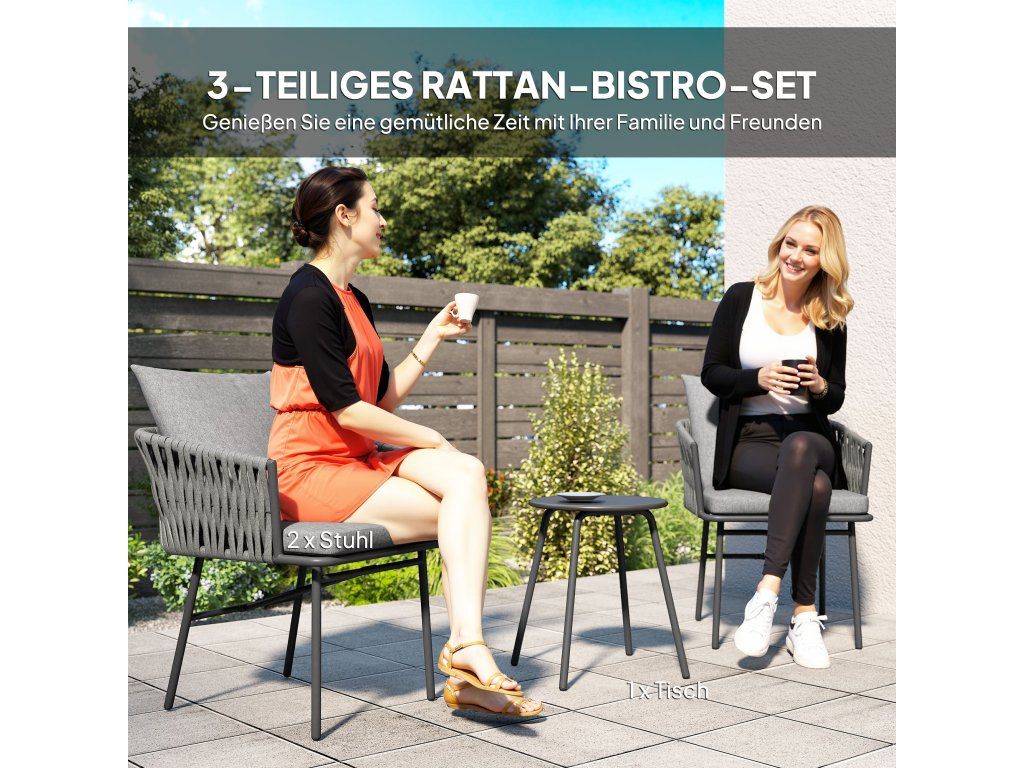Proměňte svůj venkovní prostor s touto okouzlující třídílnou balkonovou sadou. Tato sada nábytku obsahuje dvě pohodlné židle s tlustými polštáři odolnými proti stříkající vodě a elegantní stůl s kovovou deskou. Náš bistro stůl a židle jsou vyrobeny z syntetického ratanu odolného proti povětrnostním vlivům a mají rám z nerezové oceli a nabízejí pohodlí i odolnost, ideální do zahrady, na balkon nebo terasu. Potahy polštářů jsou snímatelné a pratelné pro snadnou údržbu.