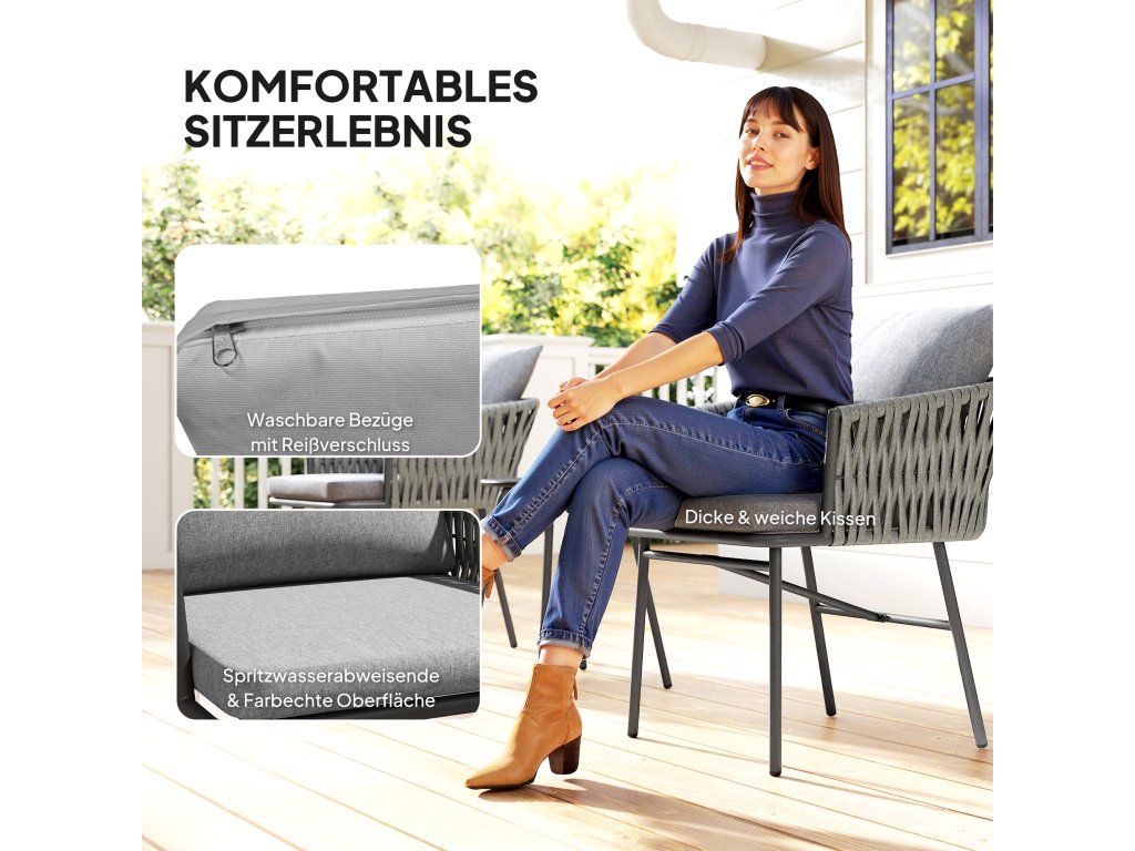 Pohodlné sezení: Užijte si maximální pohodlí s touto zahradní bistro sadou, která se vyznačuje silnými, voděodolnými sedáky a opěradly. Odnímatelné potahy usnadňují čištění a stálobarevná látka zajišťuje, že židle zůstanou dlouho svěží a zářivé.