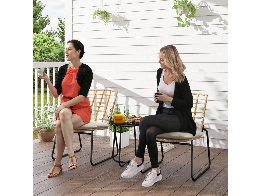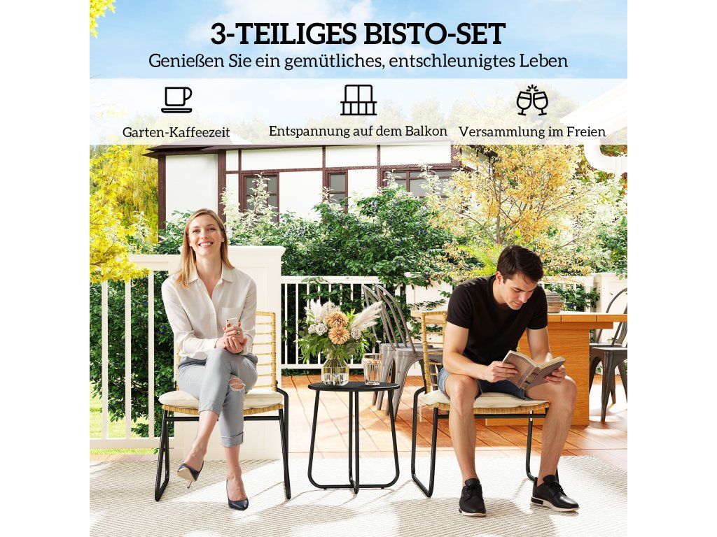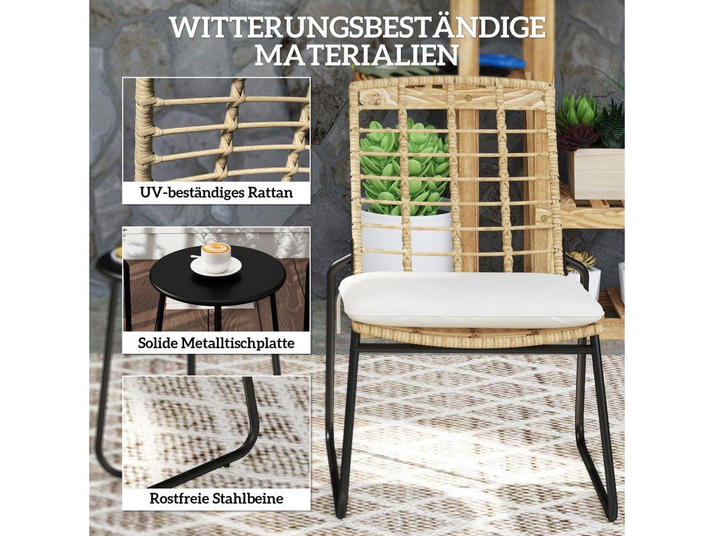 3dílná ratanová sada na terasu: Ideální pro přestávky na kávu na zahradě, útulné chvíle na balkóně a společenské venkovní večírky. Dvě židle a stůl tvoří elegantní kombinaci a vytvářejí ideální místo k relaxaci s rodinou a přáteli.