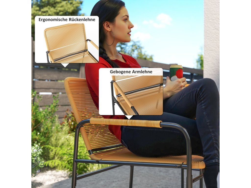 Pohodlné sezení: Židle v naší bistro sadě s mírně sklopenými ratanovými opěradly účinně snižují únavu ze sezení. Jemně zakřivené područky potažené vysoce kvalitním ratanem poskytují optimální pohodlí pro vaše paže.