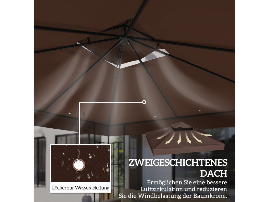 Dvoupatrová střecha altánu: Nabízí dvě úrovně, které jsou nejen vizuálně přitažlivější, ale také nabízejí lepší větrání a zvýšenou stabilitu proti větru. Střešní otvory jsou lemovány síťovinou, aby se zabránilo propíchnutí.