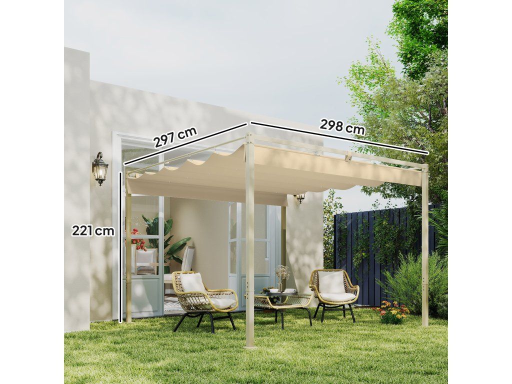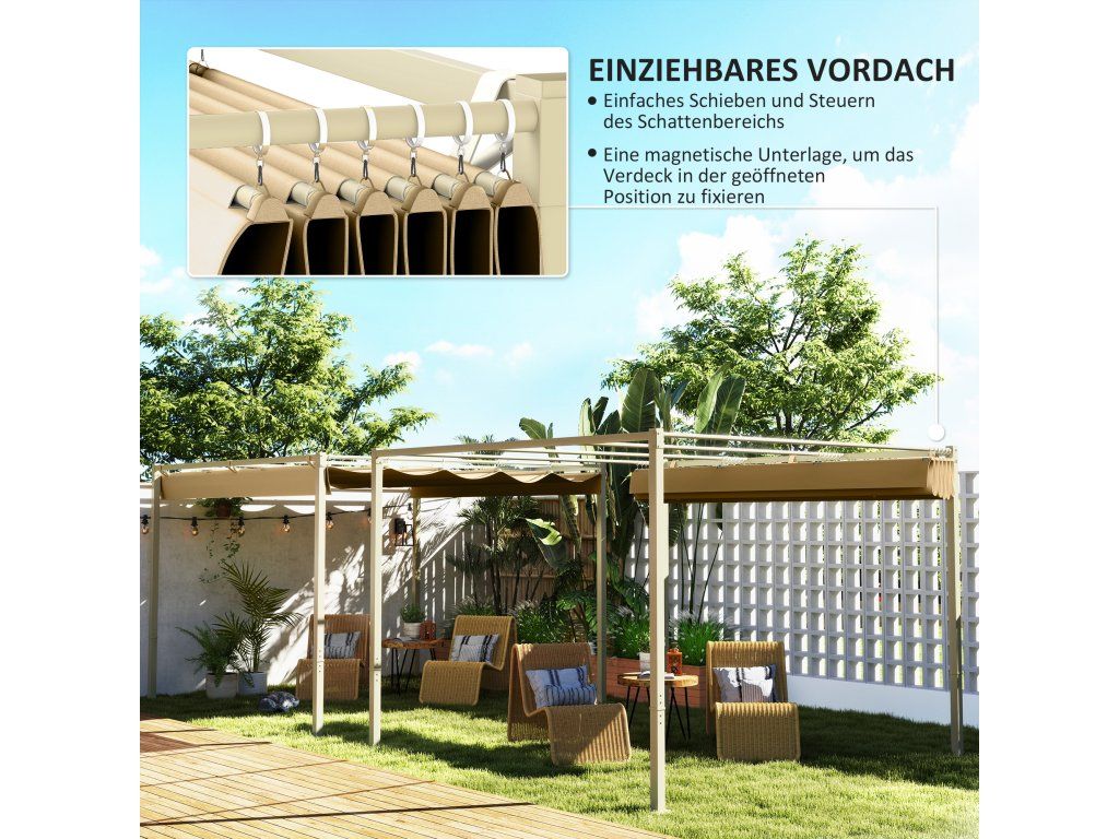 Zatahovací stříška: Pergola je vybavena zatahovací stříškou s 180g PA povlakem, ochranou UPF30+ a magnetickou podložkou pro bezpečné umístění. Není vhodná pro extrémní povětrnostní podmínky, jako je silný vítr nebo déšť.