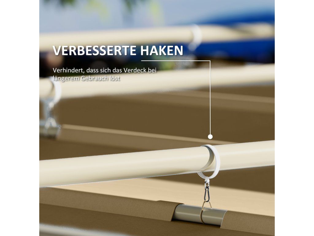Vylepšené háky: Altán je vybaven vysoce kvalitními závěsnými háky, které zajišťují plynulý chod a odolnost a zabraňují uvolnění stříšky i při intenzivním používání.