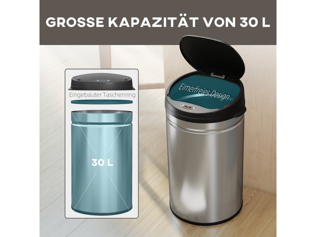 Velký objem 30 litrů: Tento elektrický odpadkový koš, navržený bez vnitřního kbelíku, optimálně využívá dostupný prostor pro větší množství odpadu – ideální do kuchyní a technických místností. Integrovaný kroužek na odpadkové pytle zajišťuje jejich uchycení a zjednodušuje jejich výměnu.