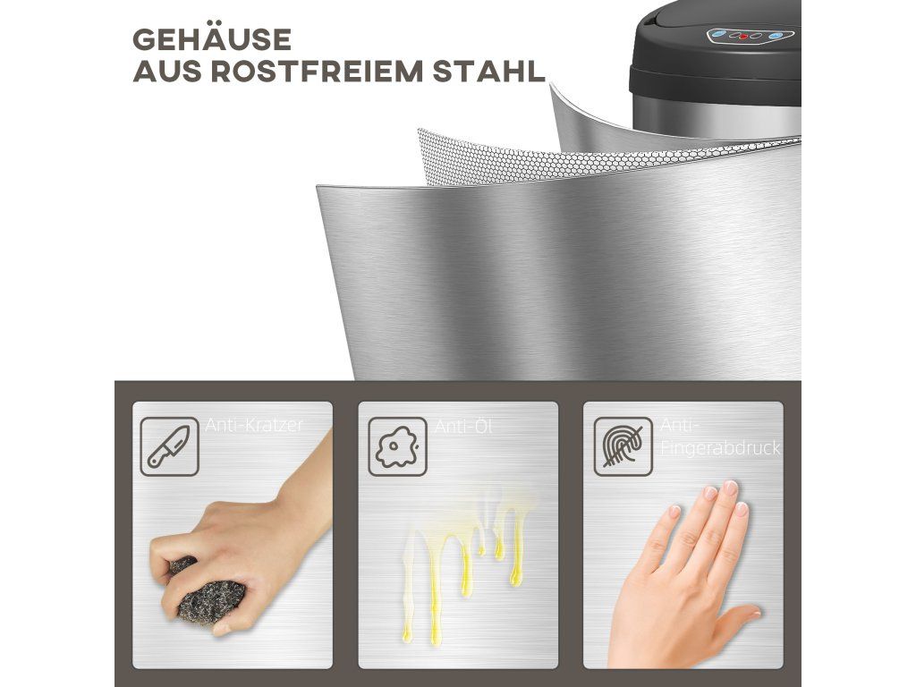 Elegantní, moderní a snadno čistitelný: Vyroben z nerezové oceli odolné proti otiskům prstů a korozi, lze tento koš snadno a rychle čistit vlhkým hadříkem. Jeho moderní stříbrná povrchová úprava dodává každé místnosti nádech elegance.