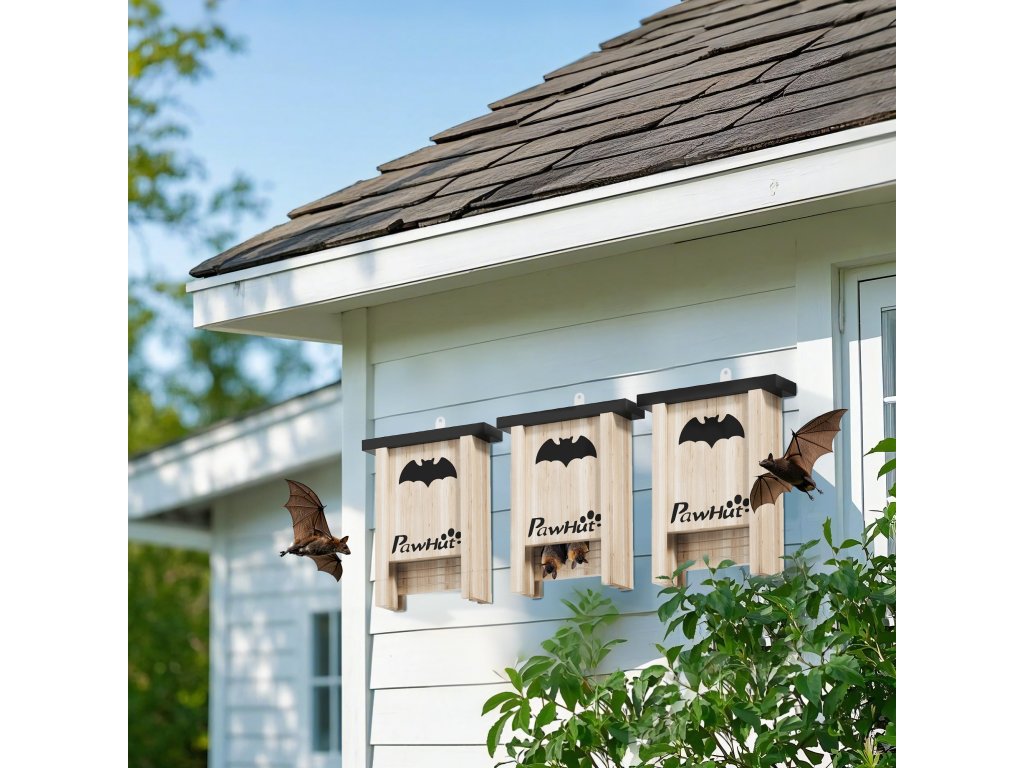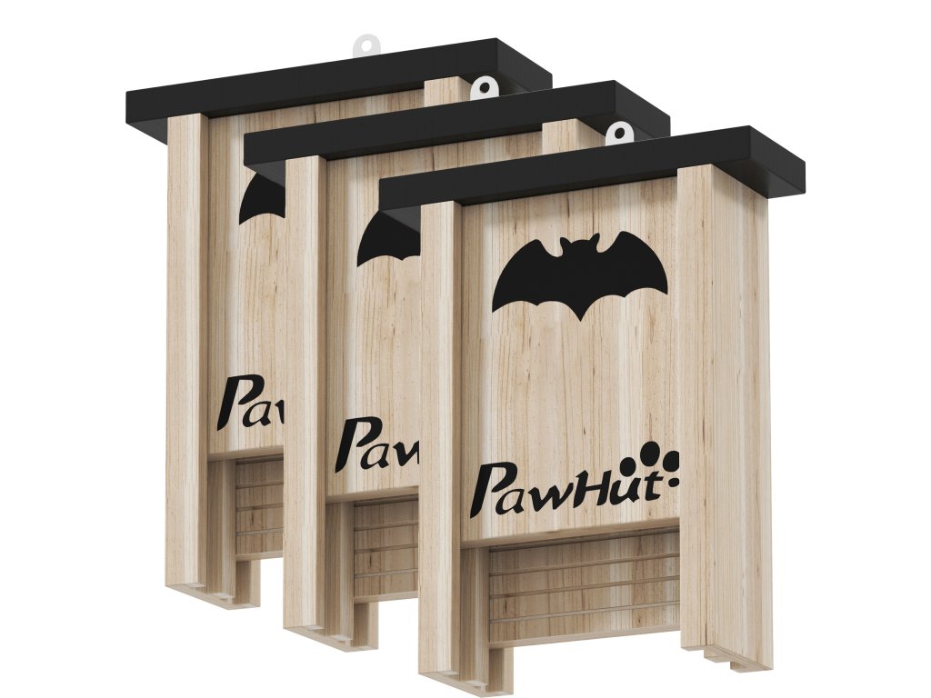 ✔ Sada tří budek pro netopýry, každá s motivem netopýra.
