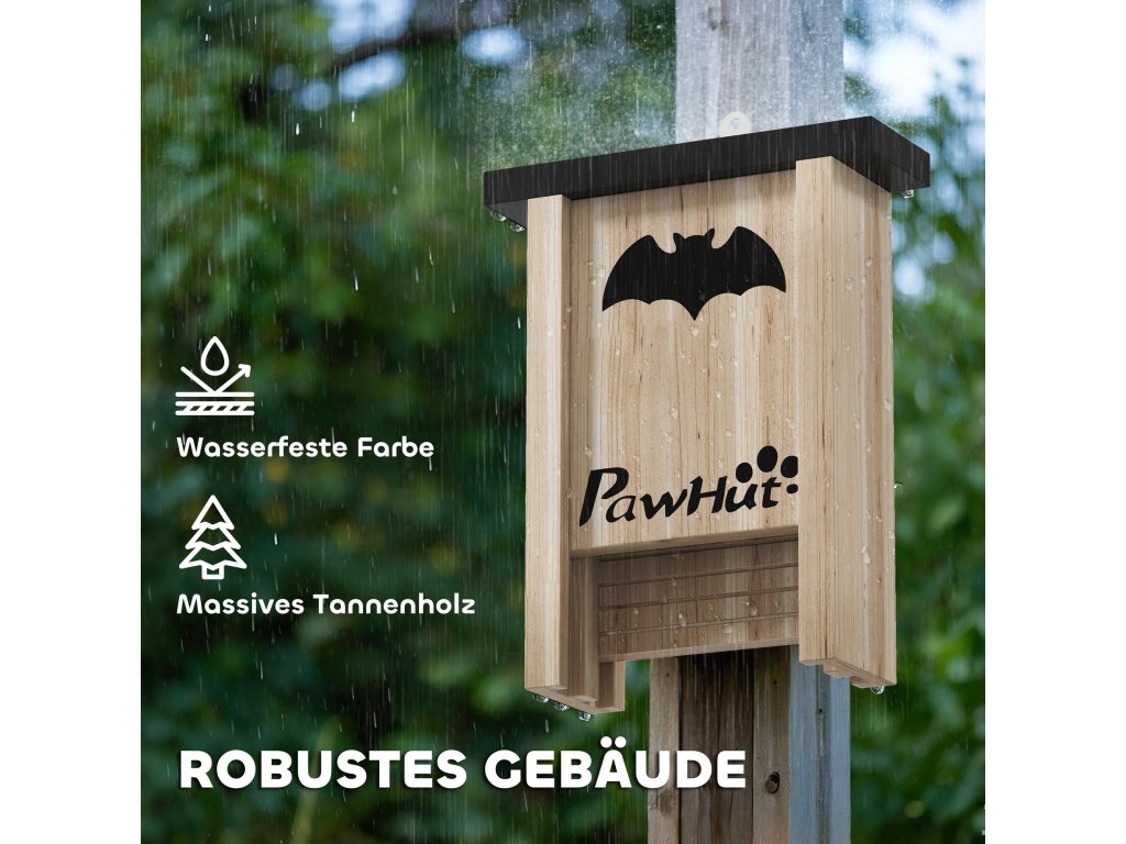 Ochrana proti povětrnostním vlivům: Tyto netopýří domky jsou vyrobeny z robustního jedlového dřeva a opatřeny voděodolnou povrchovou úpravou, odolávají živlům a poskytují netopýrům suchý a pohodlný úkryt i v dešti.