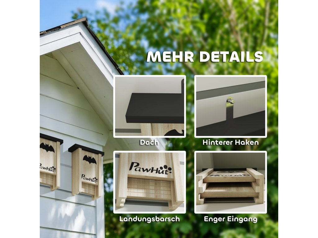 Tato sada tří smrkových dřevěných domků pro netopýry s motivem netopýra poskytuje netopýrům pohodlné útočiště díky voděodolnému nátěru. Úzká drážkovaná přistávací plošina umožňuje zvířatům snadný přístup a drží ptáky v dostatečné vzdálenosti – ideální pro farmy, sady a podobná prostředí.