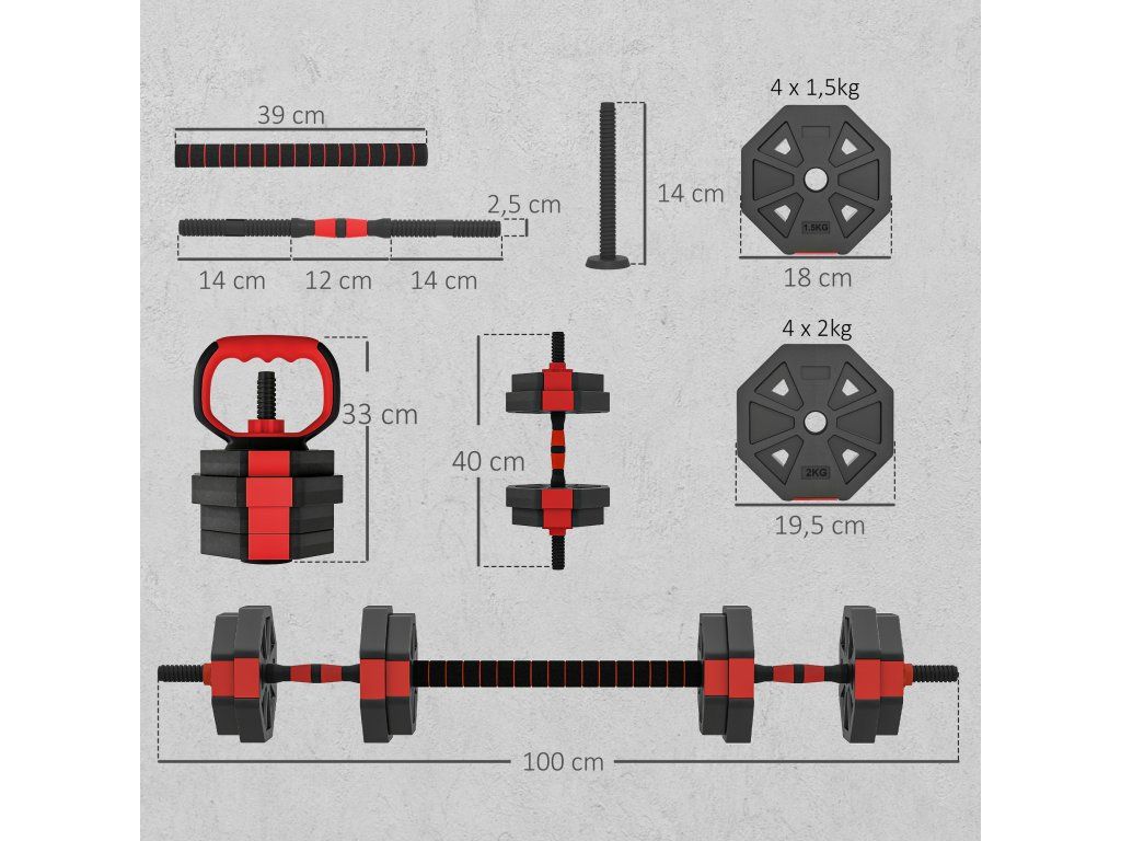 ✔ Sada 4 v 1 s hmotností 15 kg: činky, vzpěračské tyče, kettlebelly a kliky.