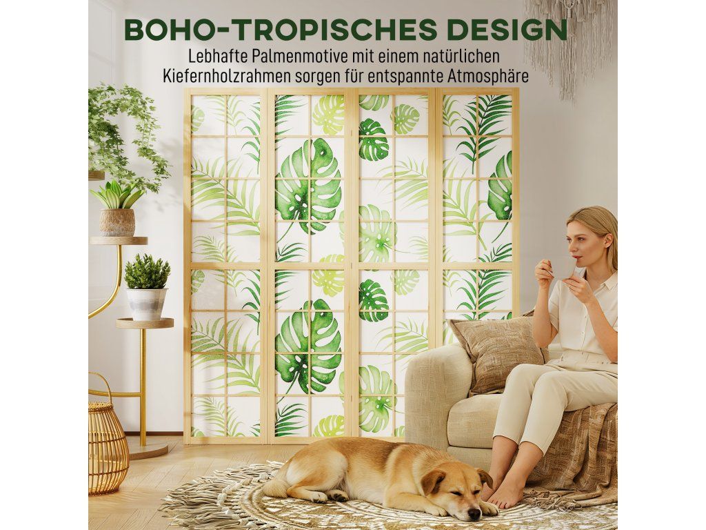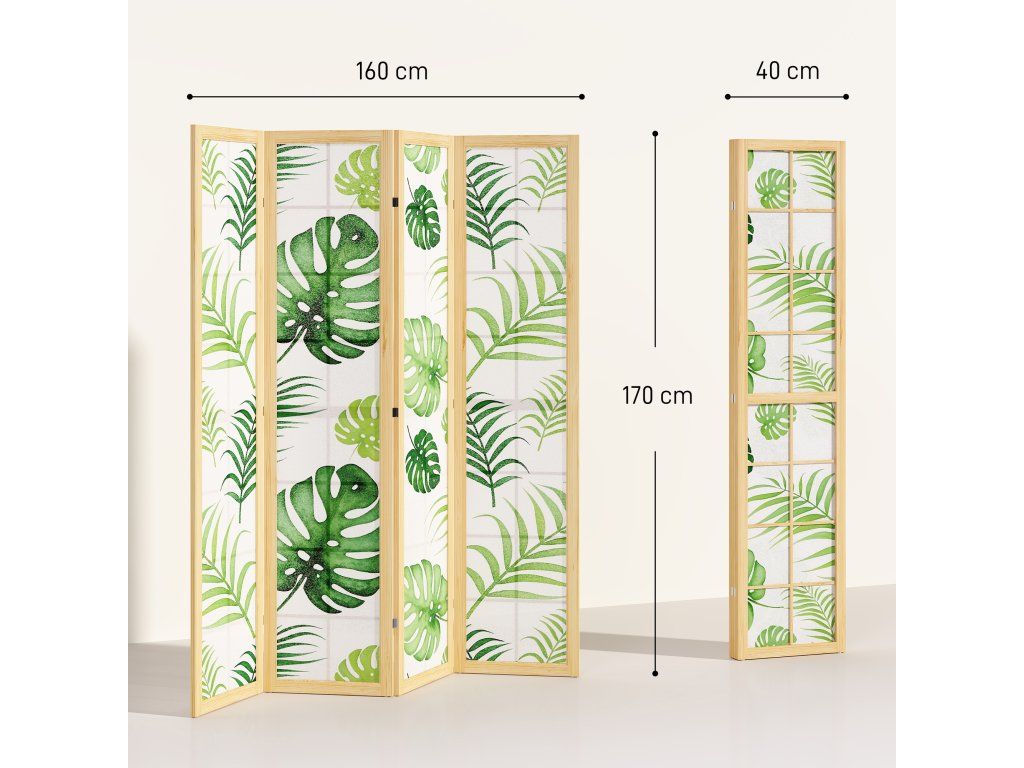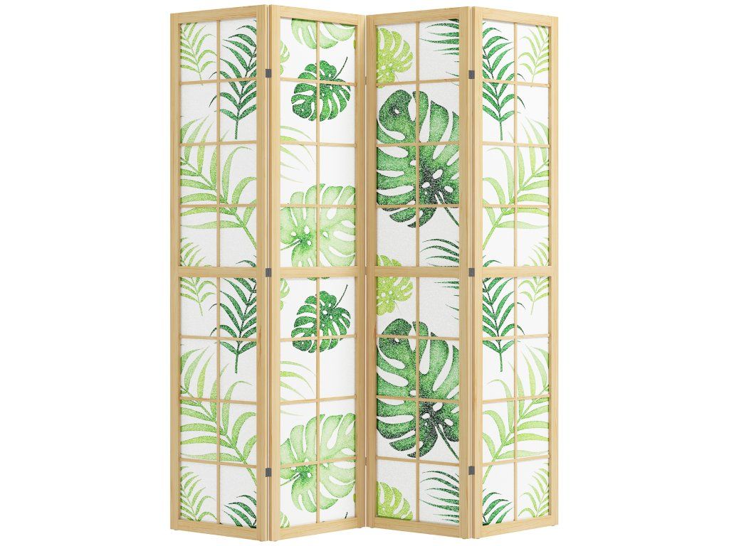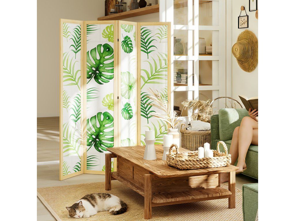 Trápí vás místnost, které chybí charakter a soukromí? Soustředění a relaxace mohou být v otevřených prostorech obtížné. Dělicí zástěna se čtyřmi panely okamžitě vytvoří soukromý koutek. Rozložte zástěnu s motivem palmy a vytvořte si pracovní prostor nebo útulný bohémský koutek. Díky flexibilním pantům můžete prostor snadno přeuspořádat a do svého domova vnést funkčnost i tropický nádech.