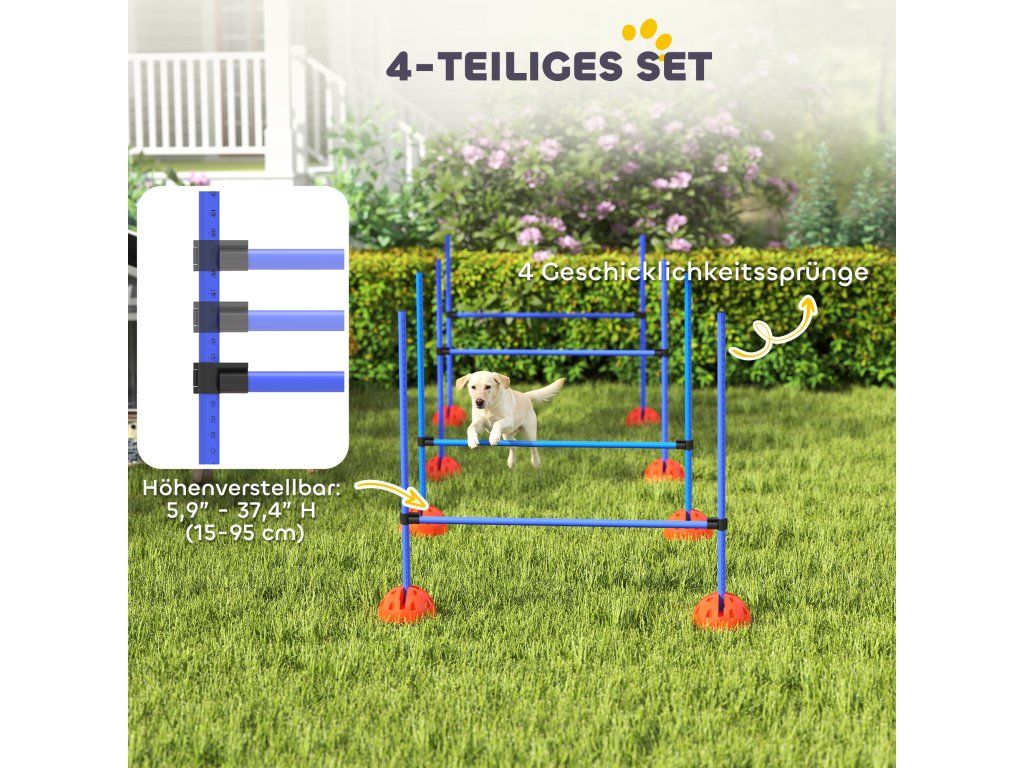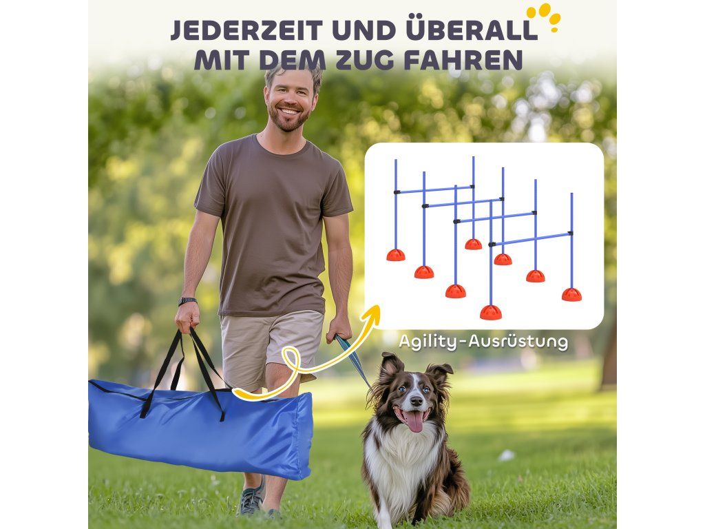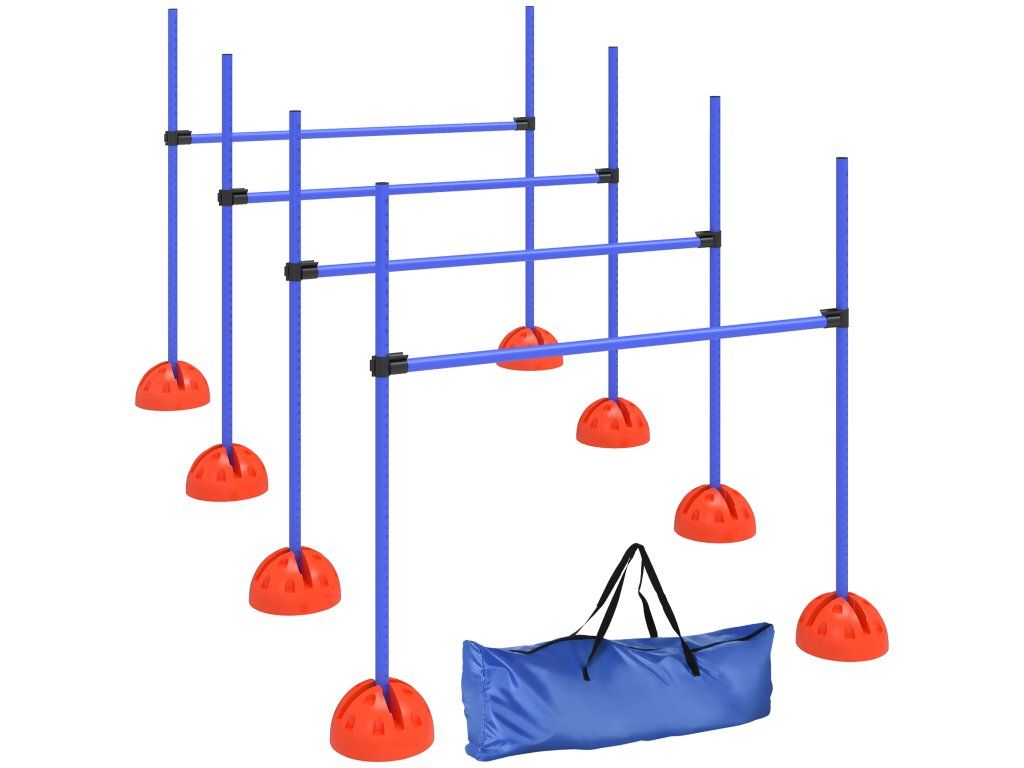 Komplexní kurz agility: Tato sada na agility obsahuje čtyři výškově nastavitelné psí skoky, které otestují dovednosti vašeho psa. Součástí balení je praktická taška pro snadné přenášení a optimální organizaci.