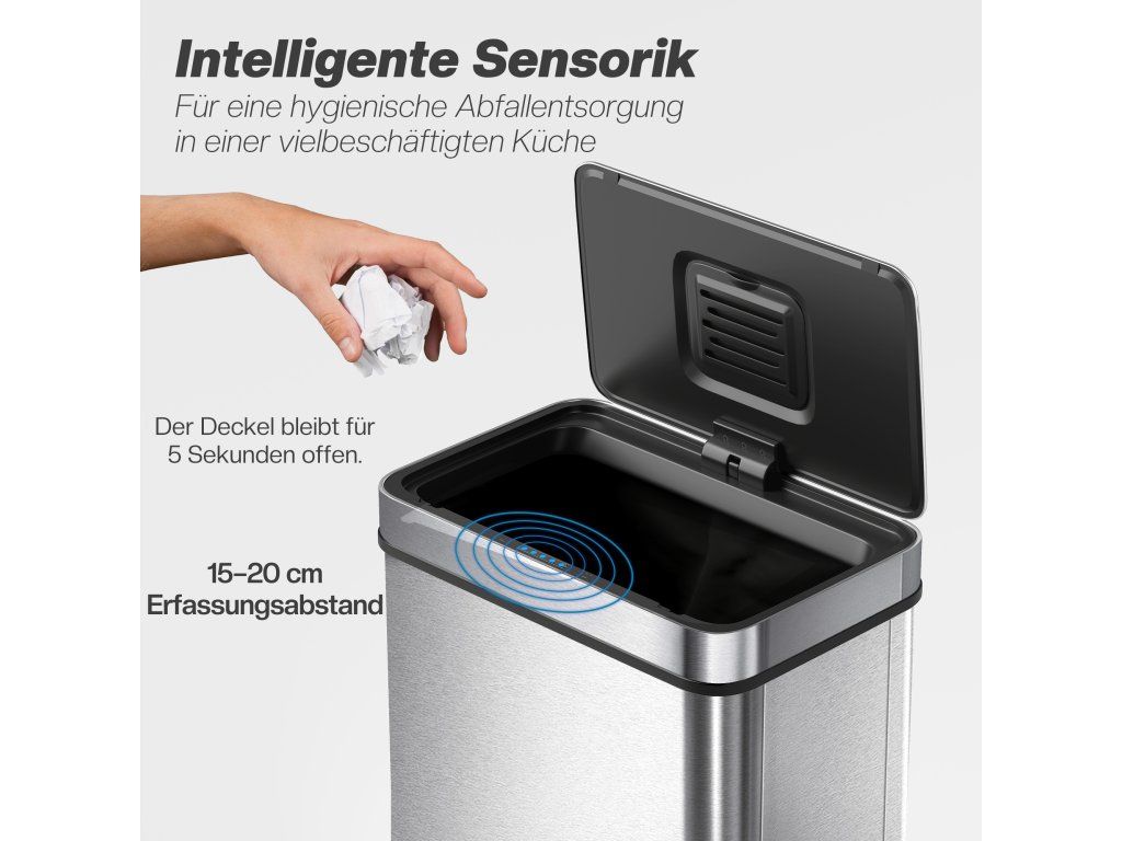 Rychlá reakce senzoru pohybu: Stačí jednoduchý pohyb ruky ze vzdálenosti 15–20 cm a senzorový odpadkový koš se otevře za pouhých 0,5 sekundy. Ideální pro použití v kuchyních, tělocvičnách, kancelářích a dalších prostorách s vysokou frekvencí pohybu.