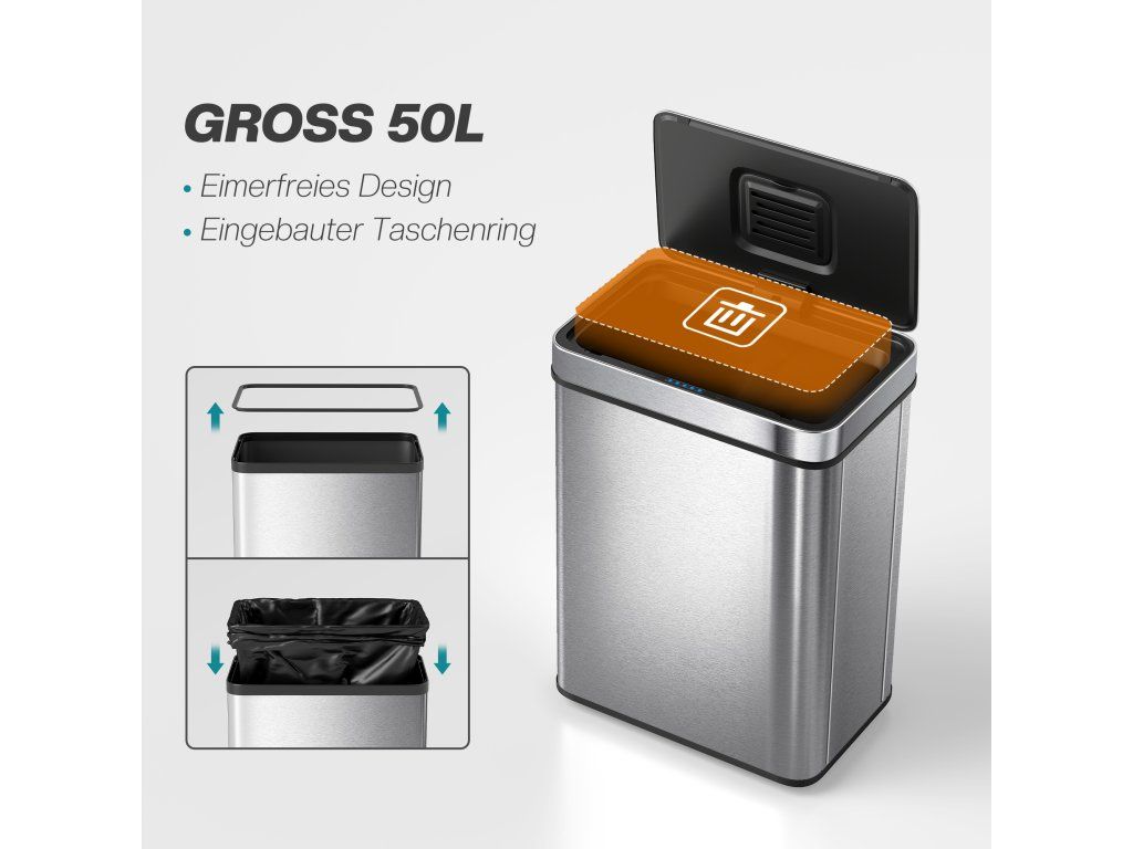 ✔ Extra velká kapacita 50 litrů pojme více odpadu s kroužkem pro zajištění vložek do koše.