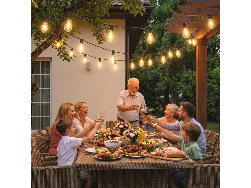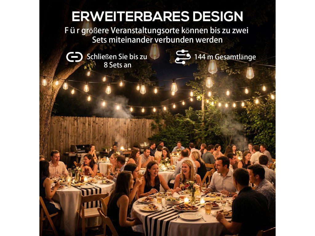 Nedostatečné LED osvětlení může zkazit večerní akce. LED řetězová světla s teplým, vintage světlem, dlouhá přes 18 metrů, vytvářejí magickou atmosféru. Pro komplexní pokrytí můžete propojit až osm sad. Díky jednoduché a flexibilní instalaci vytvoříte okouzlující atmosféru, která promění vaši vysněnou akci ve skutečnost.