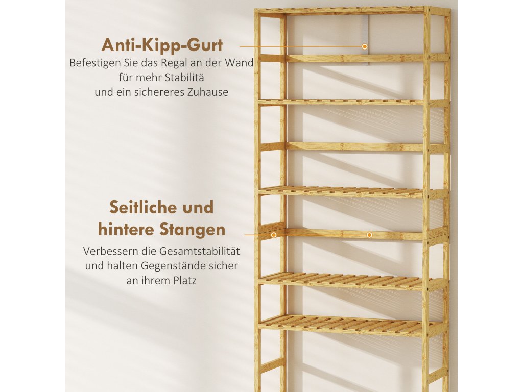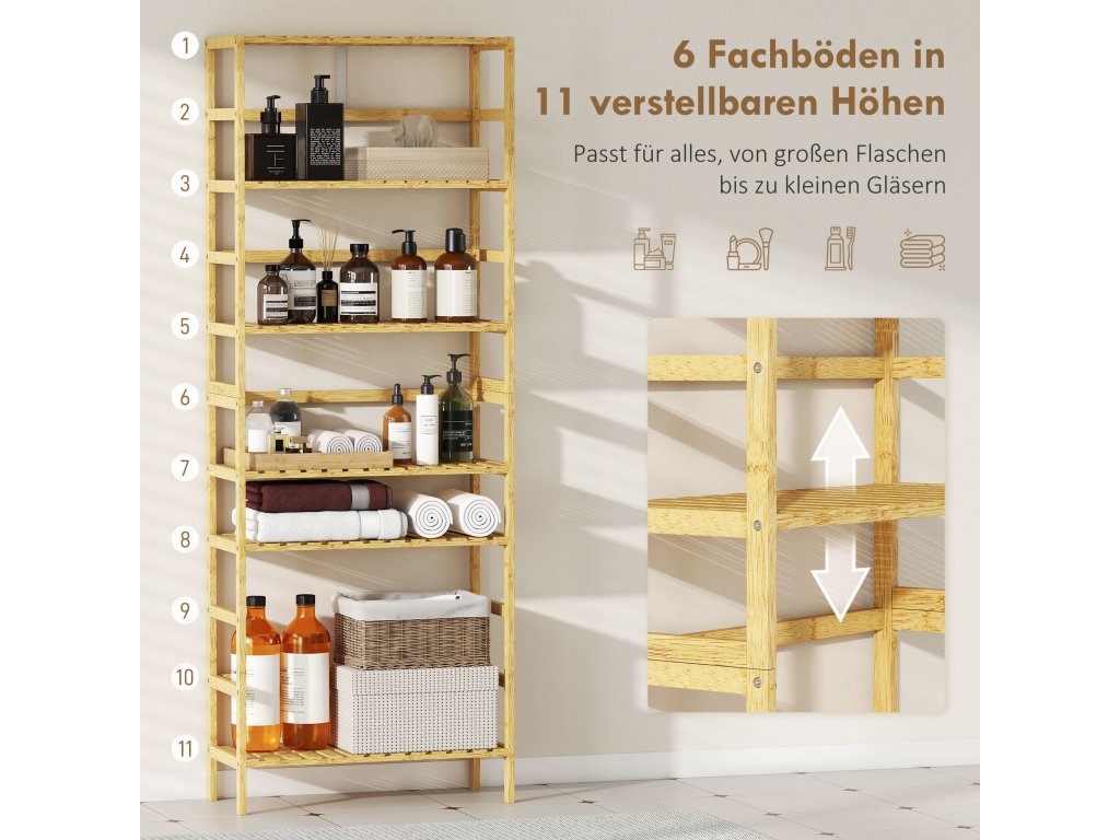 Tato štíhlá volně stojící police nabízí dostatek úložného prostoru pro vše od velkých váz až po drobnou kosmetiku. Flexibilní bambusový design police přináší do obývacích pokojů nebo koupelen pocit klidu a pořádku, proměňuje nepraktické zákoutí v atraktivní úložné prostory a zvyšuje pohodlí díky své funkční eleganci.