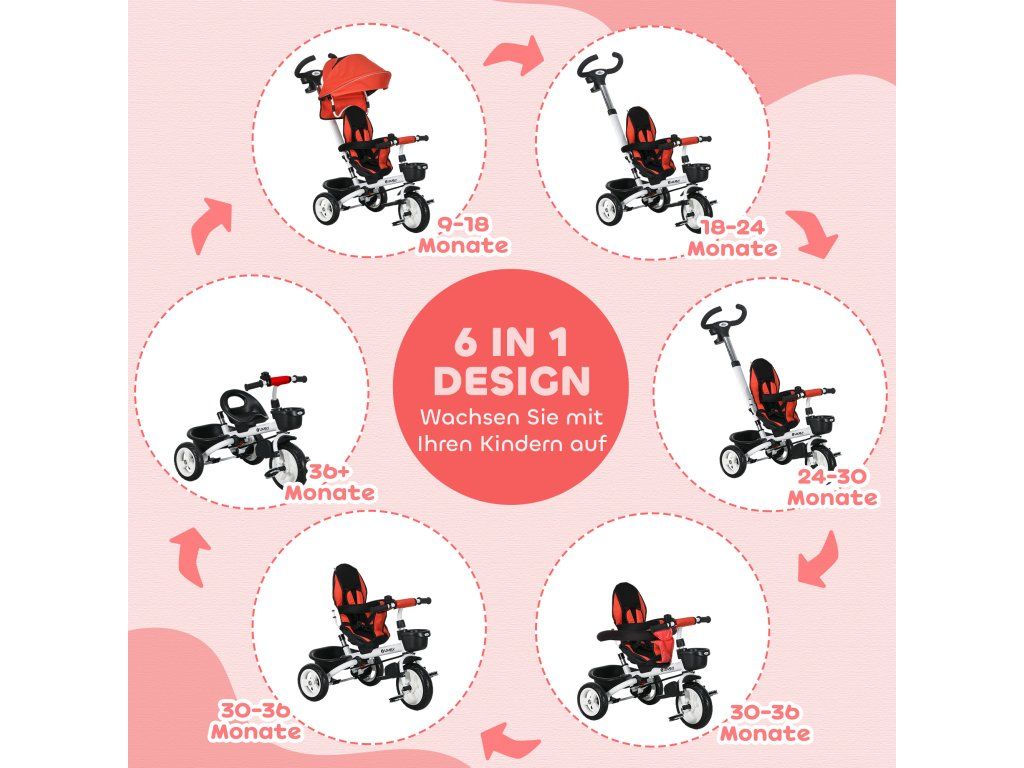 Všestranné použití: Tříkolku lze používat ve čtyřech různých režimech, aby se dokonale přizpůsobila rostoucím potřebám vašeho dítěte. Funguje jako odrážedlo nebo tříkolka, každá s rukojetí pro rodičovskou kontrolu nebo bez ní. Vhodné pro děti od 12 měsíců.