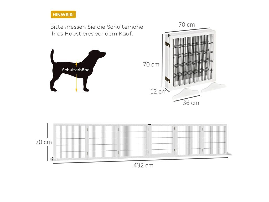 Podrobnosti o produktu branka pro psy: Celkové rozměry: 432 x 36 x 70 cm. Rozměry jednoho kusu: 70 x 70 cm. Vzdálenost mezi lamelami: 2,2 cm. Vhodné pro malé až středně velké psy. Nevhodné pro psy, kteří jsou příliš silní nebo rádi skáčou. Poznámka: Pro zvýšení stability výrobku se doporučuje umístit lamely klikatě.
