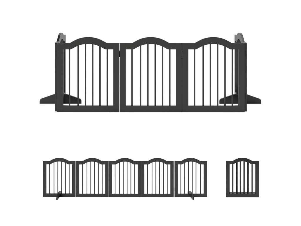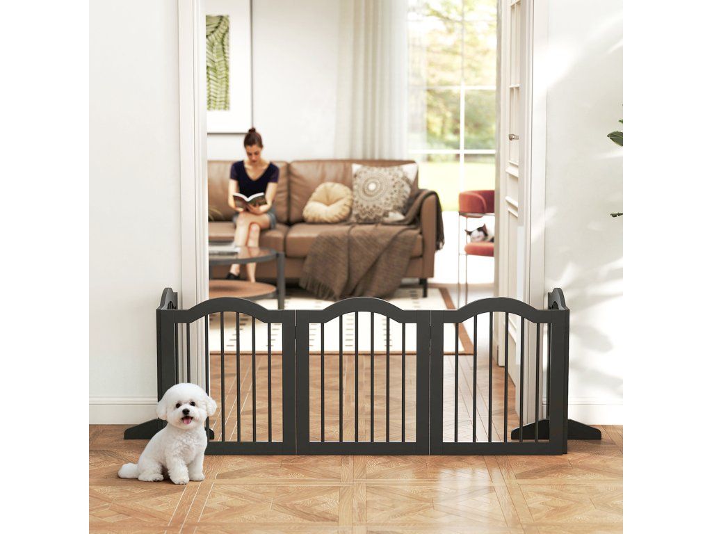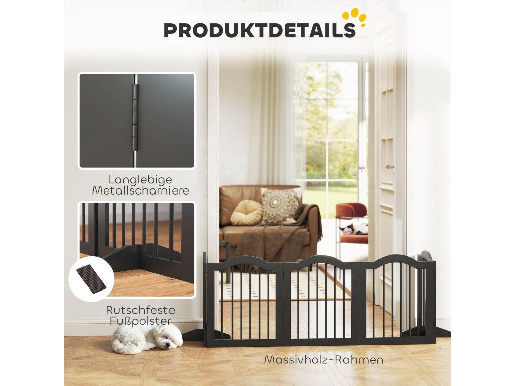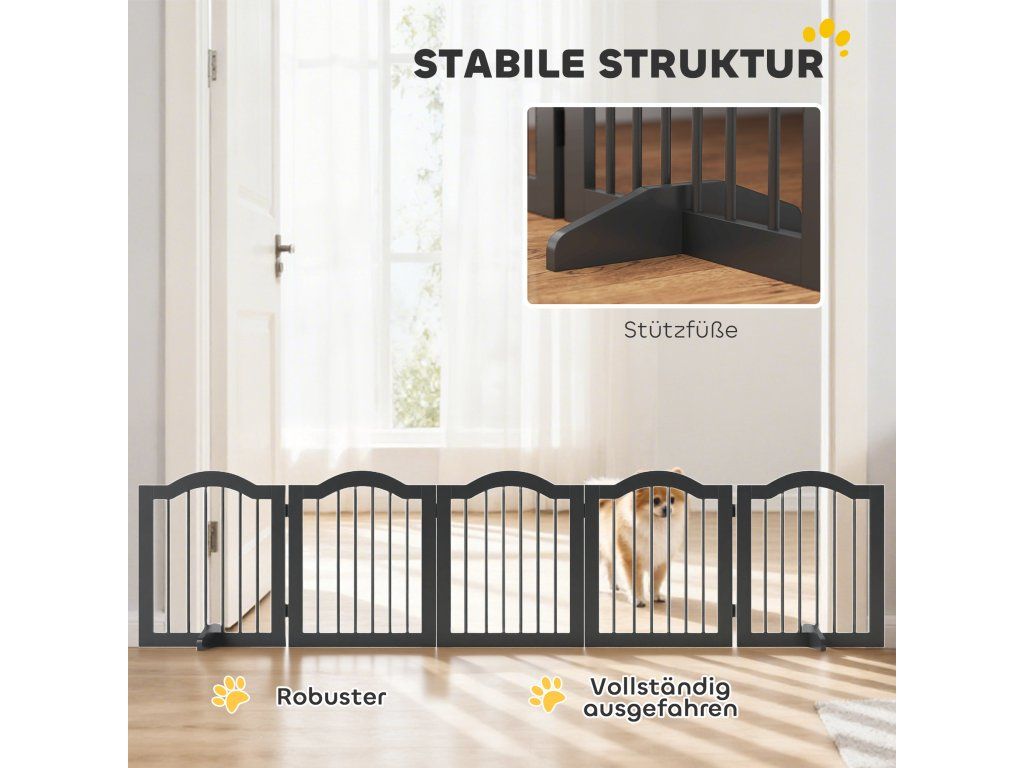 Robustní konstrukce: Psí branka se skládá z pěti robustních panelů spojených robustními panty. Podpěrné nohy zajišťují stabilitu a zabraňují převrácení, a to i u aktivních psů.