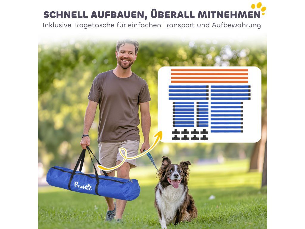 Rychlá montáž a přenosnost: Díky chytrému systému zasouvání lze každou výcvikovou tyč sestavit během několika minut bez použití nářadí. Odolná přepravní taška z materiálu Oxford 600D udrží vše úhledně uložené a je ideální pro mobilní výcvik psů.