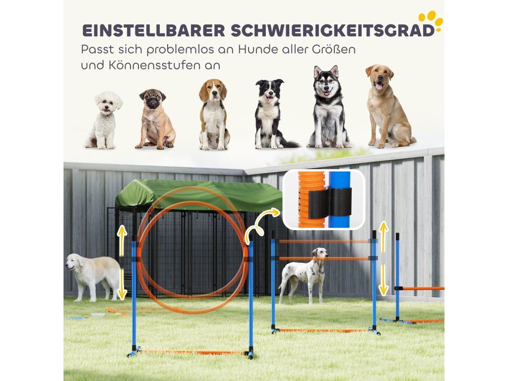 Rychlá montáž bez použití nářadí: Díky konektorům může agility sadu pro psy sestavit jedna osoba během několika minut. Přepravní vak usnadňuje přepravu do parků a rozšiřuje společenský okruh vašeho mazlíčka.